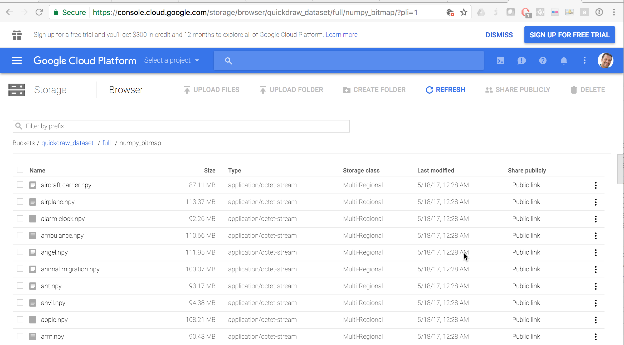 As a starting point, Google has graciously made the dataset publicly available with documentation on the dataset. All the data is sitting in Google’s Cloud Console, but for the images, you want this link of the numpy_bitmaps.