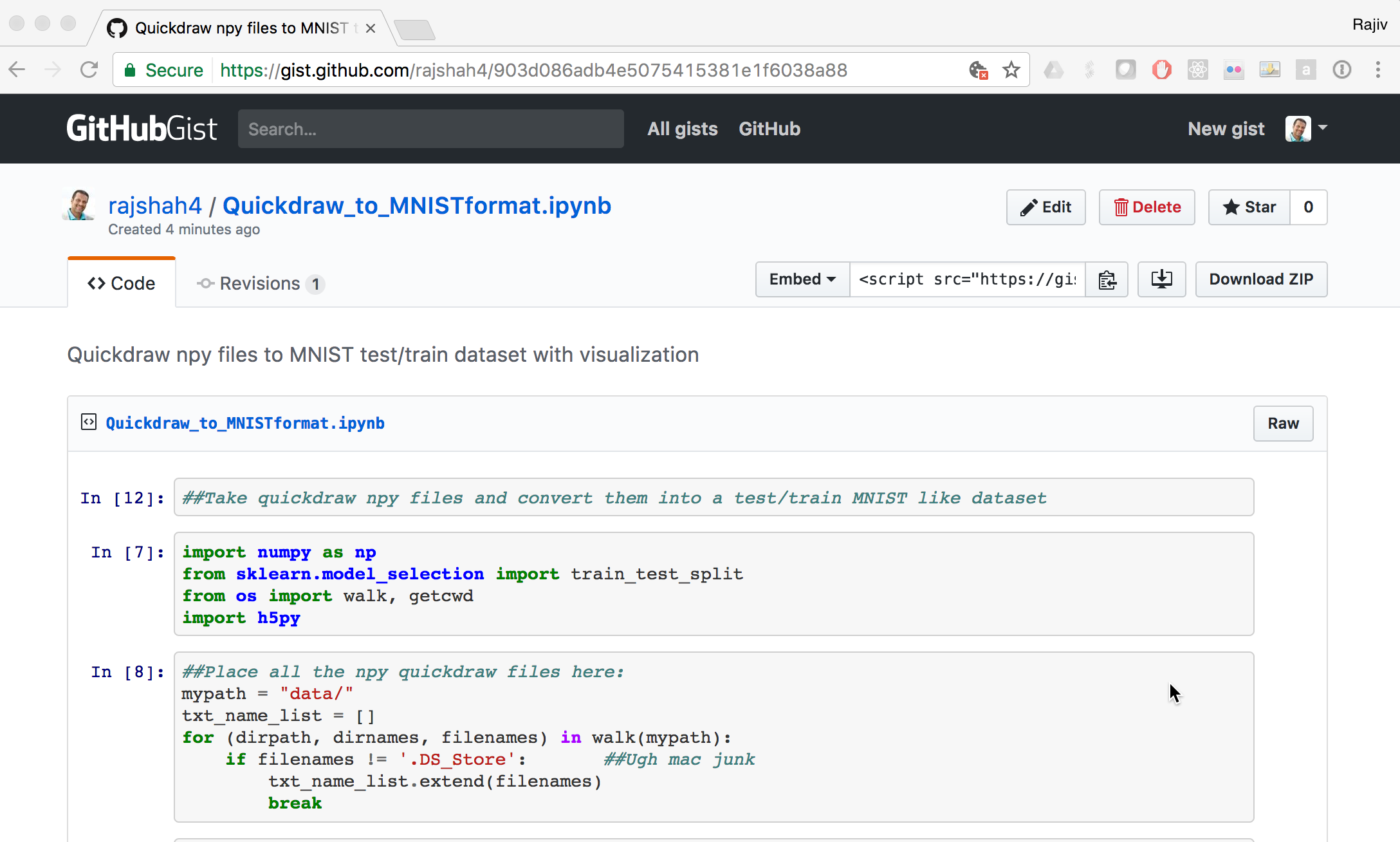 The next challenge is taking these .npy files and using them. Here is a short python gist that I used to read the .npy files and combine them to create a 80,000 images dataset that I could use in place of MNIST. They are saved in a hdf5 format that is cross platform and often used in deep learning.