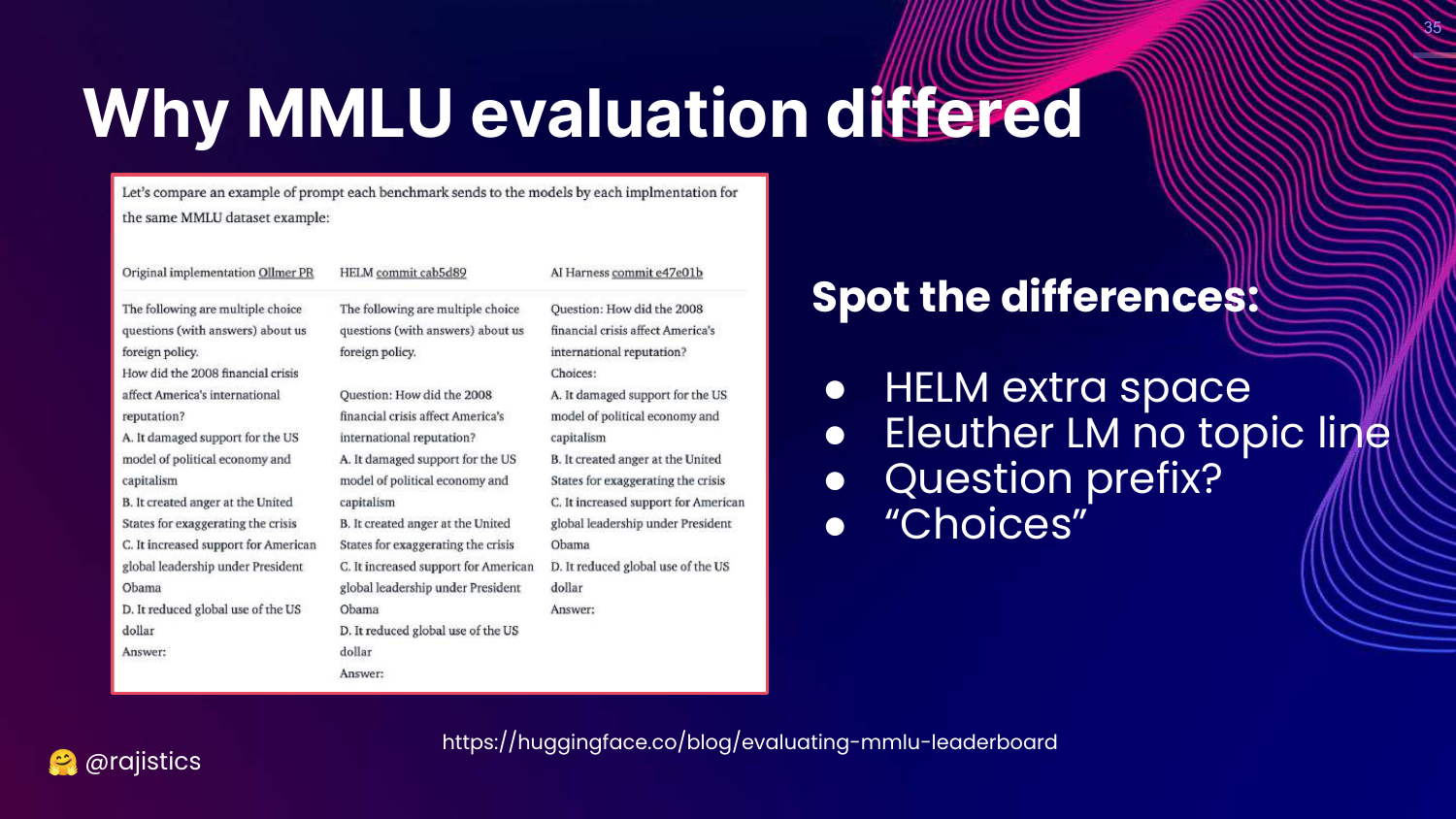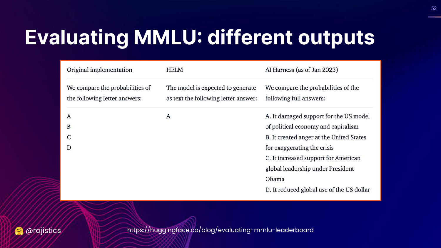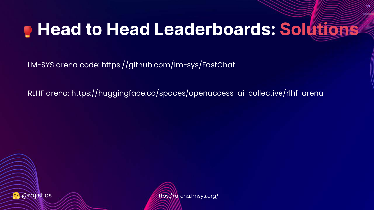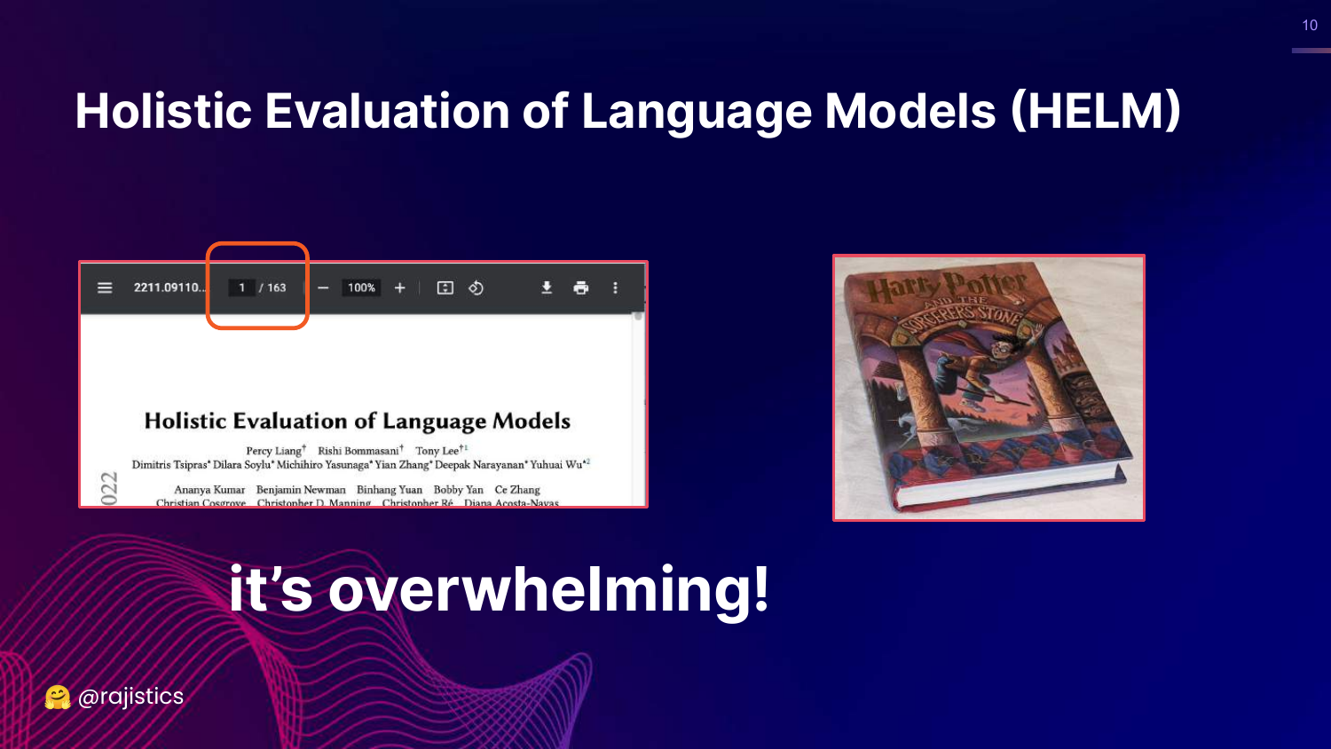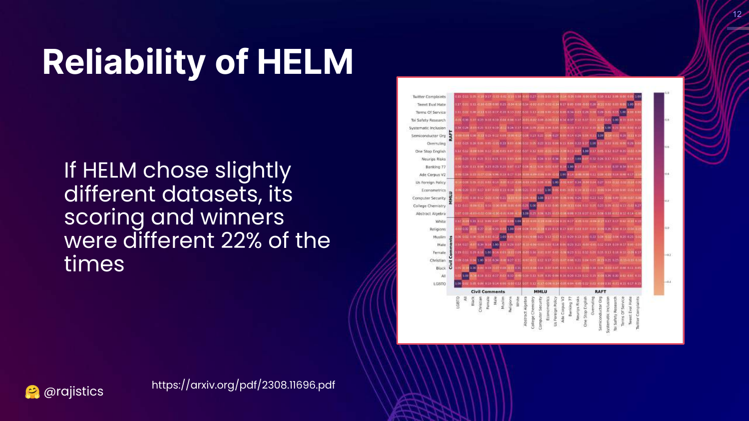 Rajiv presents HELM as the academic approach to the evaluation problem. It attempts to be comprehensive by measuring everything across many dimensions, offering a more rigorous alternative to simple leaderboards.