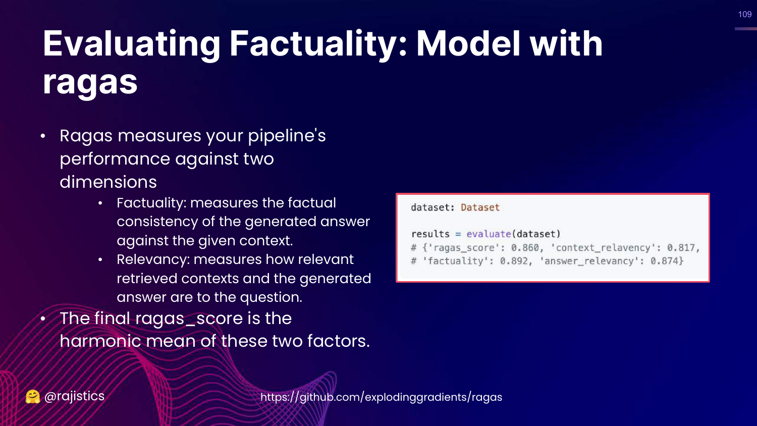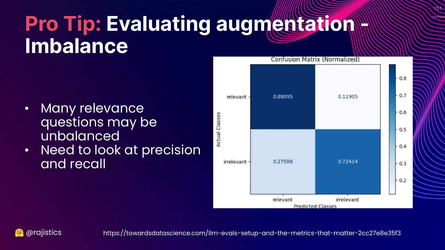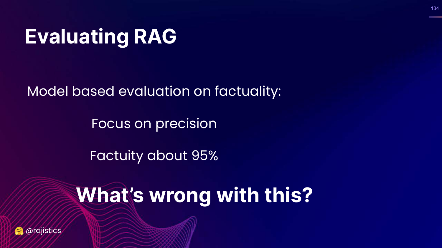 This slide shows a “recipe” for RAG evaluation focusing solely on factuality precision (95%).