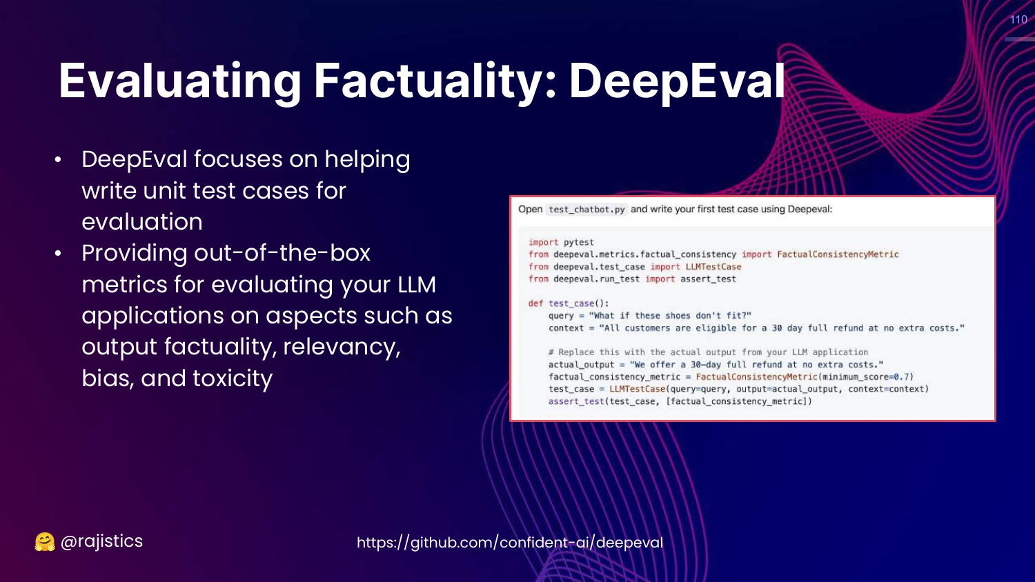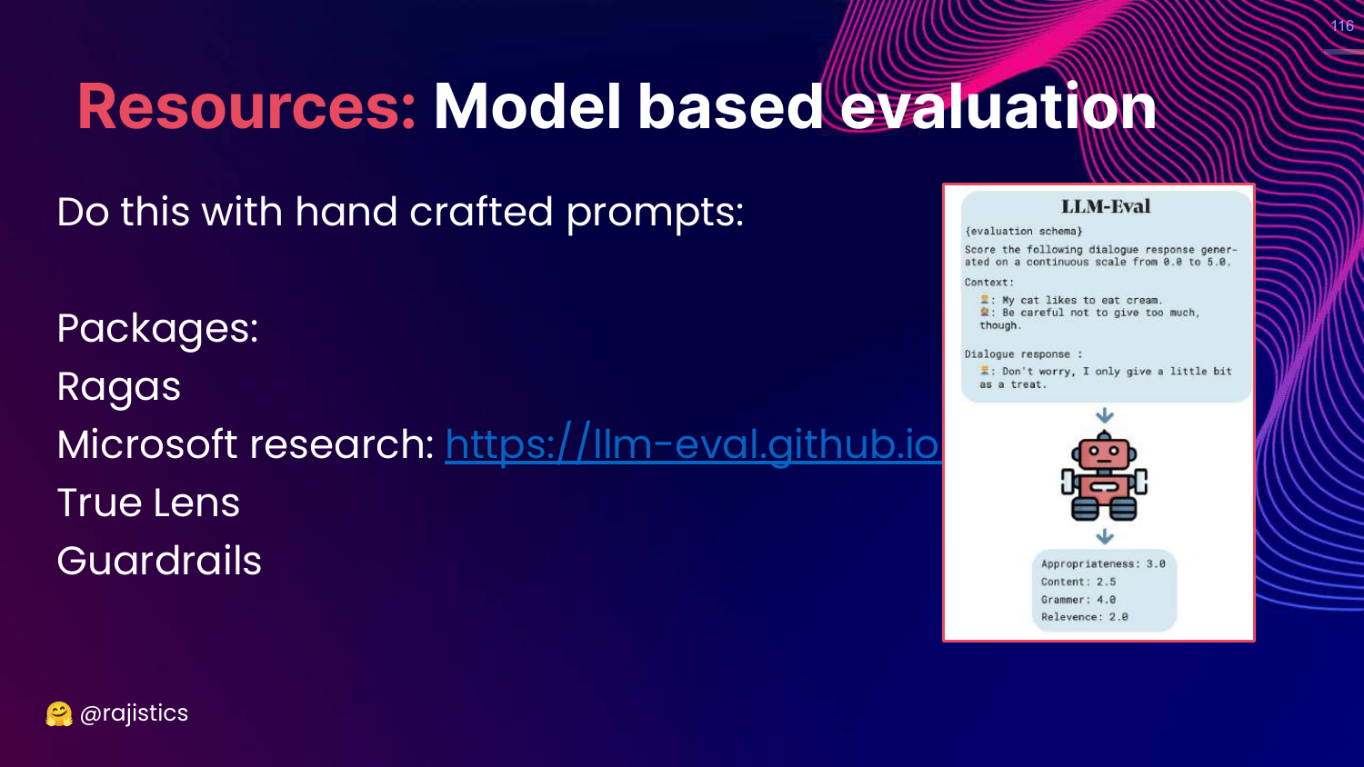 This slide lists libraries: Ragas, Microsoft llm-eval, TrueLens, Guardrails.