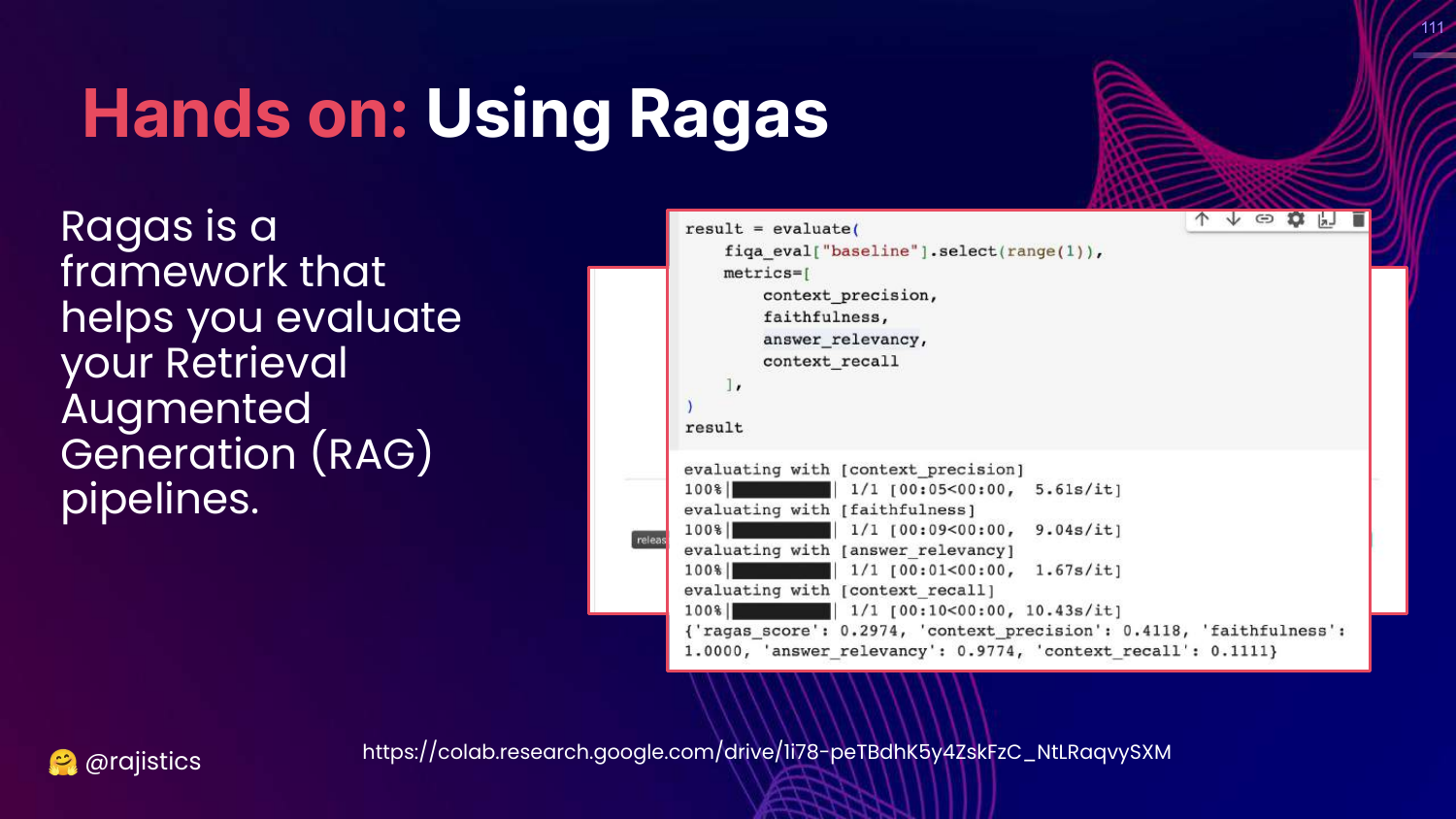 Rajiv introduces this here to promise a practical application of the concepts. He explains that after covering the evaluation methods, he will demonstrate how to apply them specifically to a RAG system.