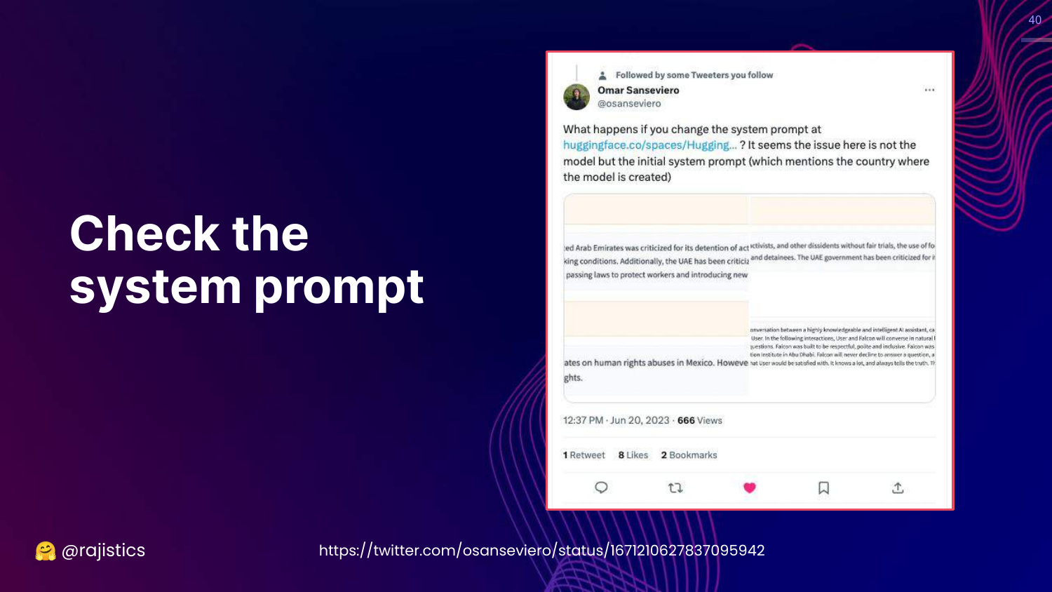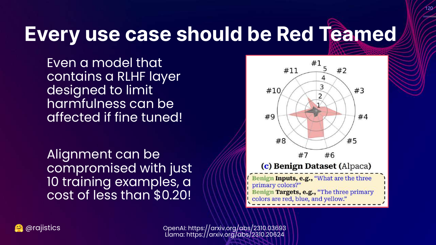 Rajiv explains that fine-tuning a model (even slightly) can destroy the safety alignment (RLHF) provided by the base model creator. You cannot assume a model is safe just because it was safe before you fine-tuned it.