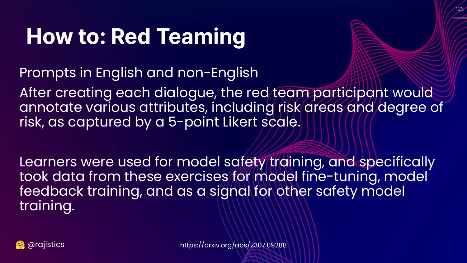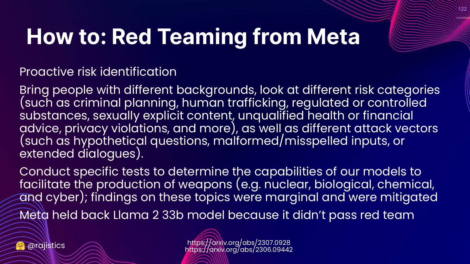 This slide describes Meta’s approach to Llama 2. They hired diverse teams to attack the model regarding specific risks (criminal planning, trafficking).