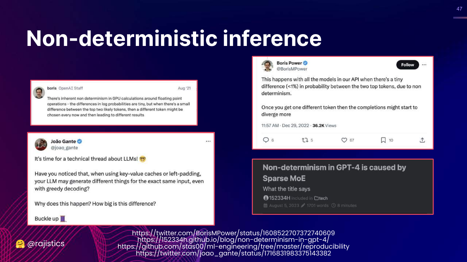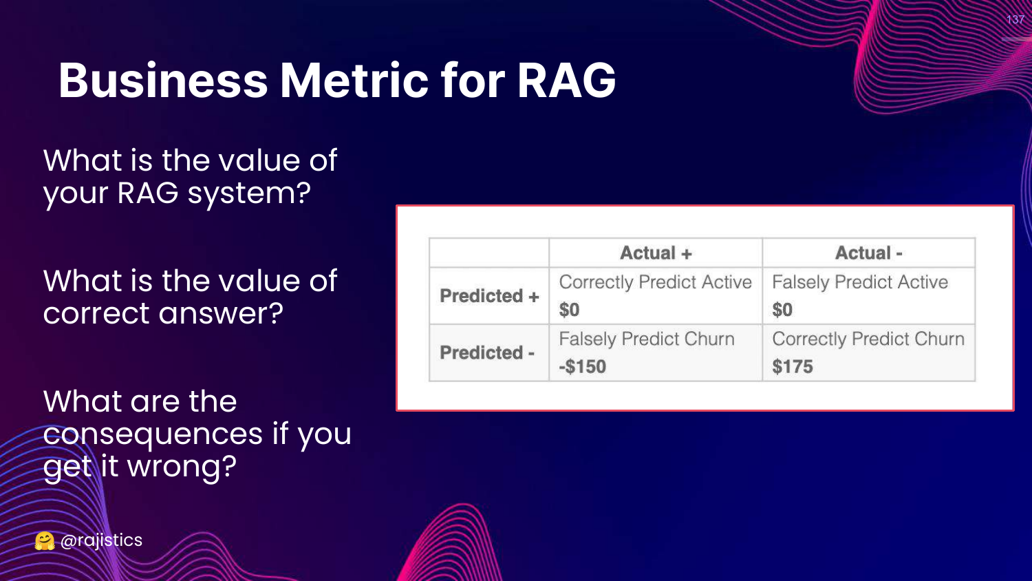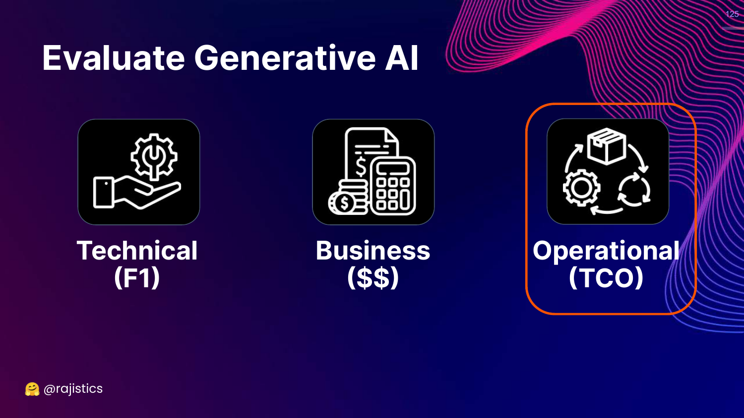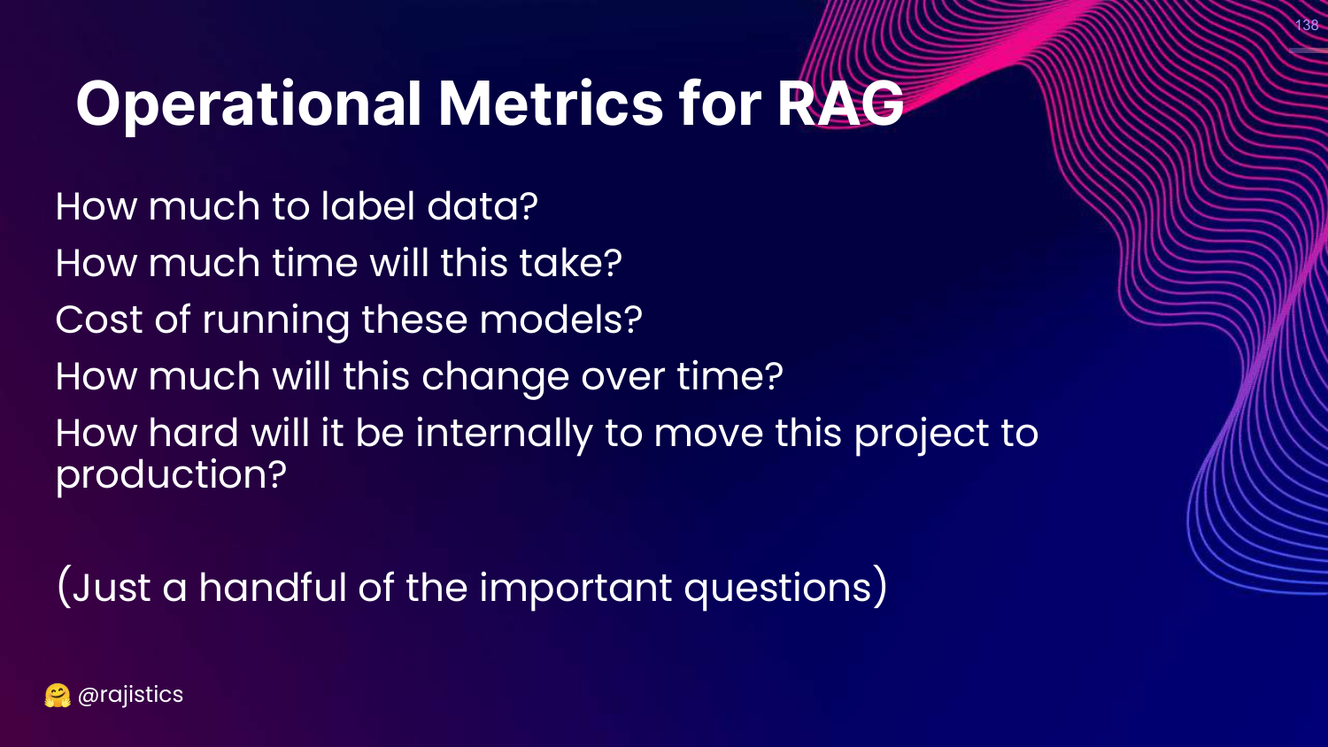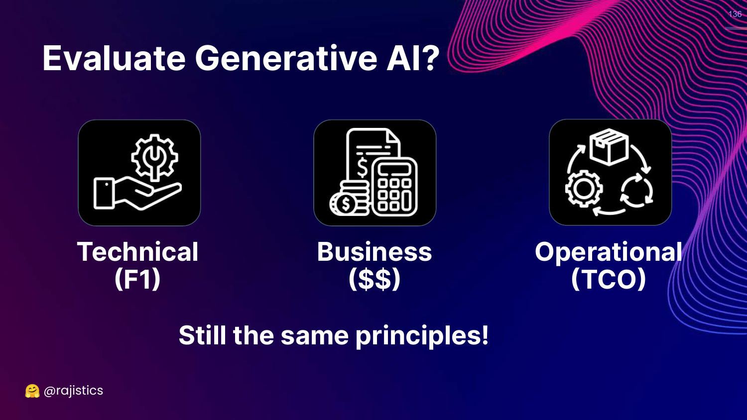 Rajiv reinforces that despite the hype and novelty of LLMs, we must not abandon standard engineering practices. We still need to measure technical accuracy (F1 equivalent), business impact ($$), and operational costs (TCO).