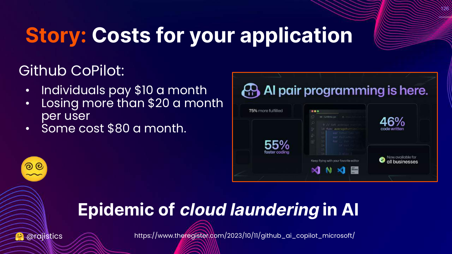This slide references a story that GitHub Copilot was losing money per user (costing $20-$80/month while charging $10).