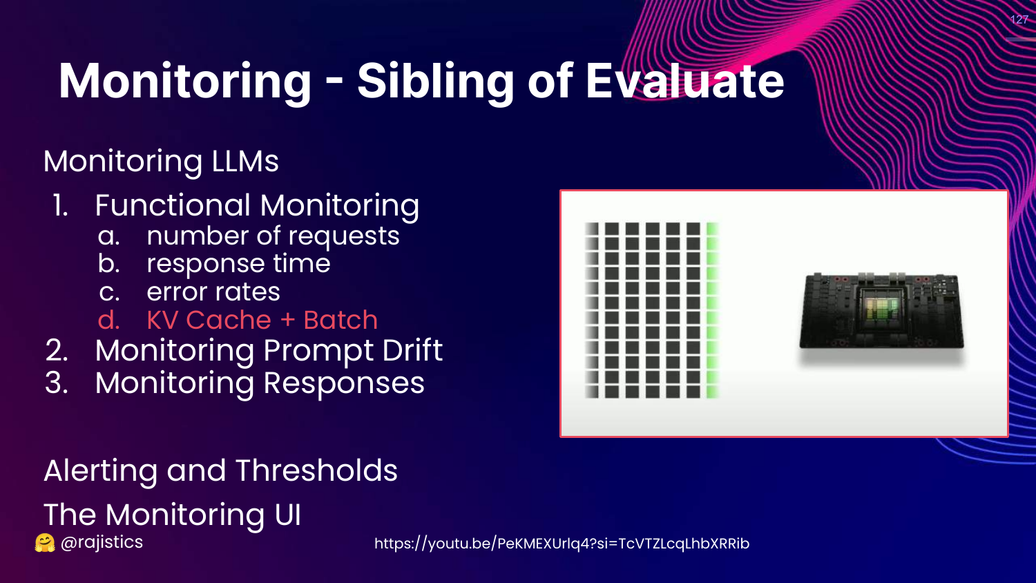 It lists things to watch: Functional metrics (latency, errors), Prompt Drift, and Response Monitoring.