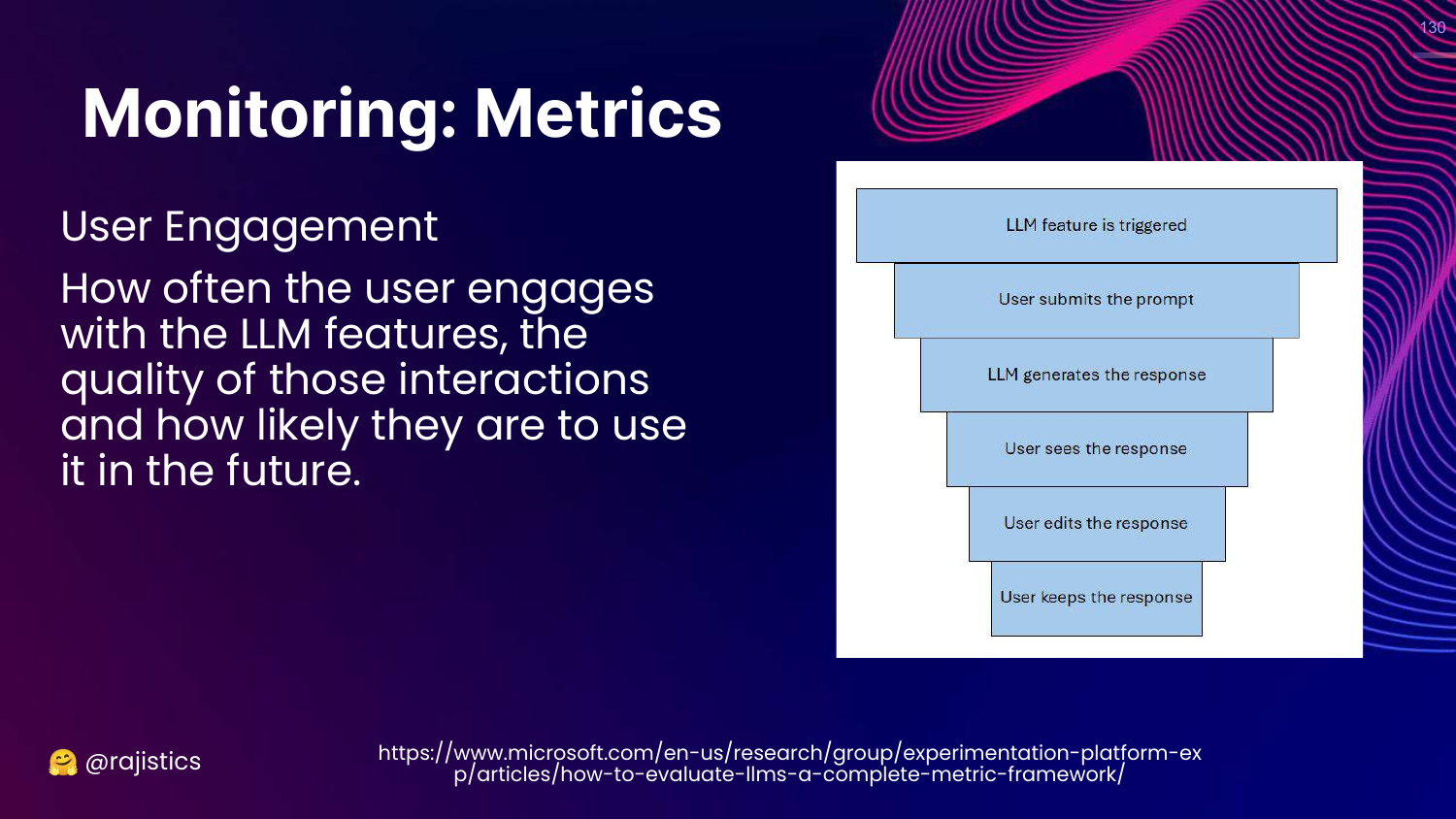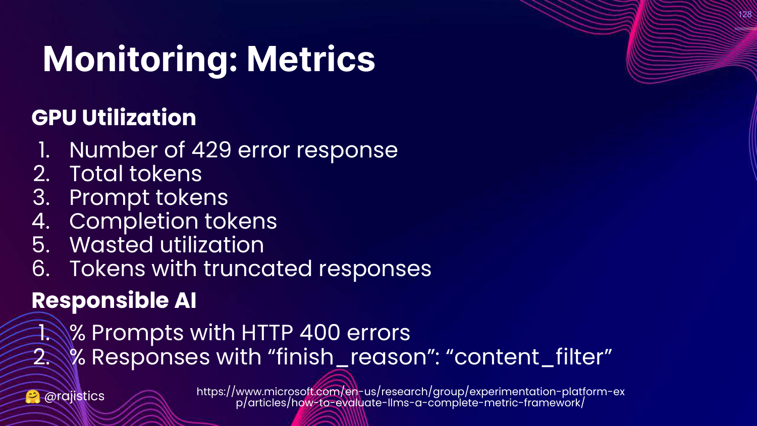 This slide lists specific metrics. * GPU: Error rates (429), token counts. * Responsible AI: How often is the content filter triggering?