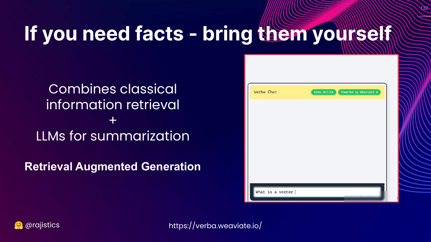 This slide explains the core philosophy of RAG: “If you need facts - bring them yourself.” Don’t rely on the LLM’s training data; provide the context.