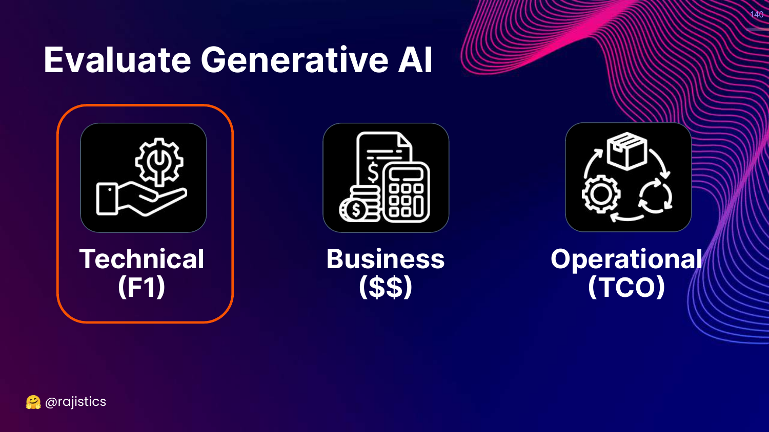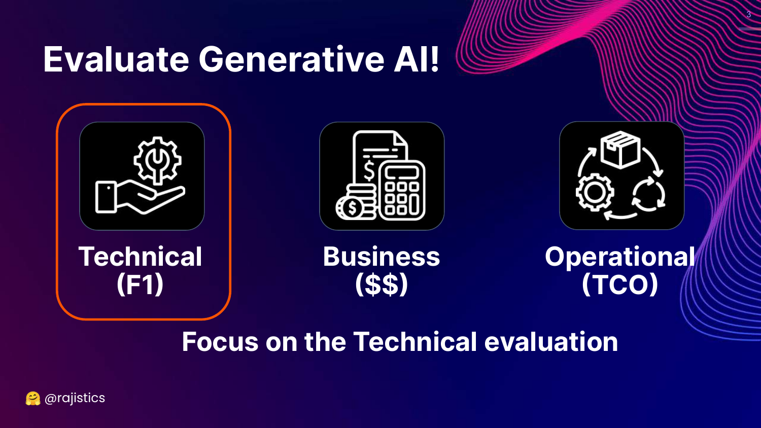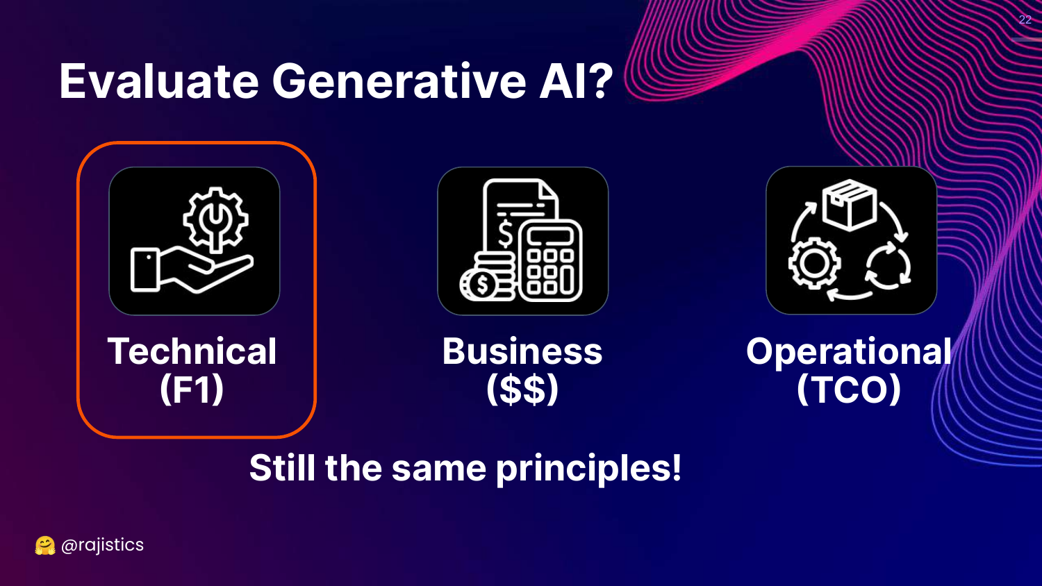 This slide breaks down Generative AI evaluation into three critical dimensions: Technical (F1), Business ($$), and Operational (TCO). While the talk focuses heavily on technical metrics, Rajiv stresses that the other two are equally vital for production success.