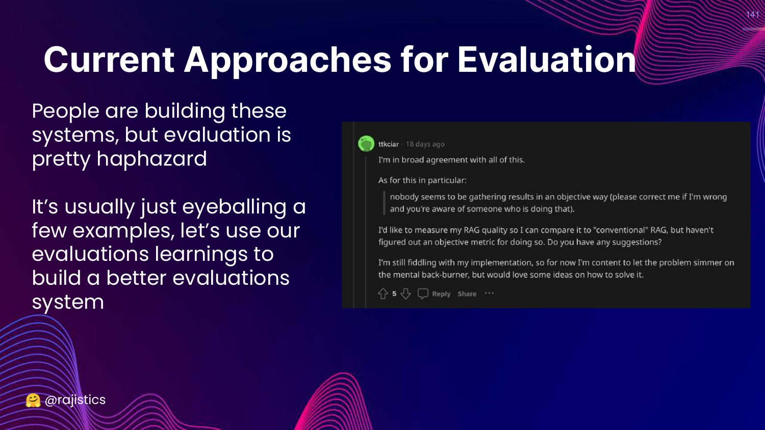 Rajiv sets the stage by explaining his motivation: he sees many enterprises treating Generative AI as “science experiments” that fail to reach production. He argues that a major reason for this failure is a lack of proper evaluation strategies.