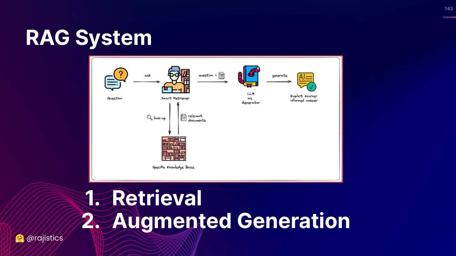 This slide brings back the RAG diagram, emphasizing decomposition. 1. Retrieval 2. Augmented Generation