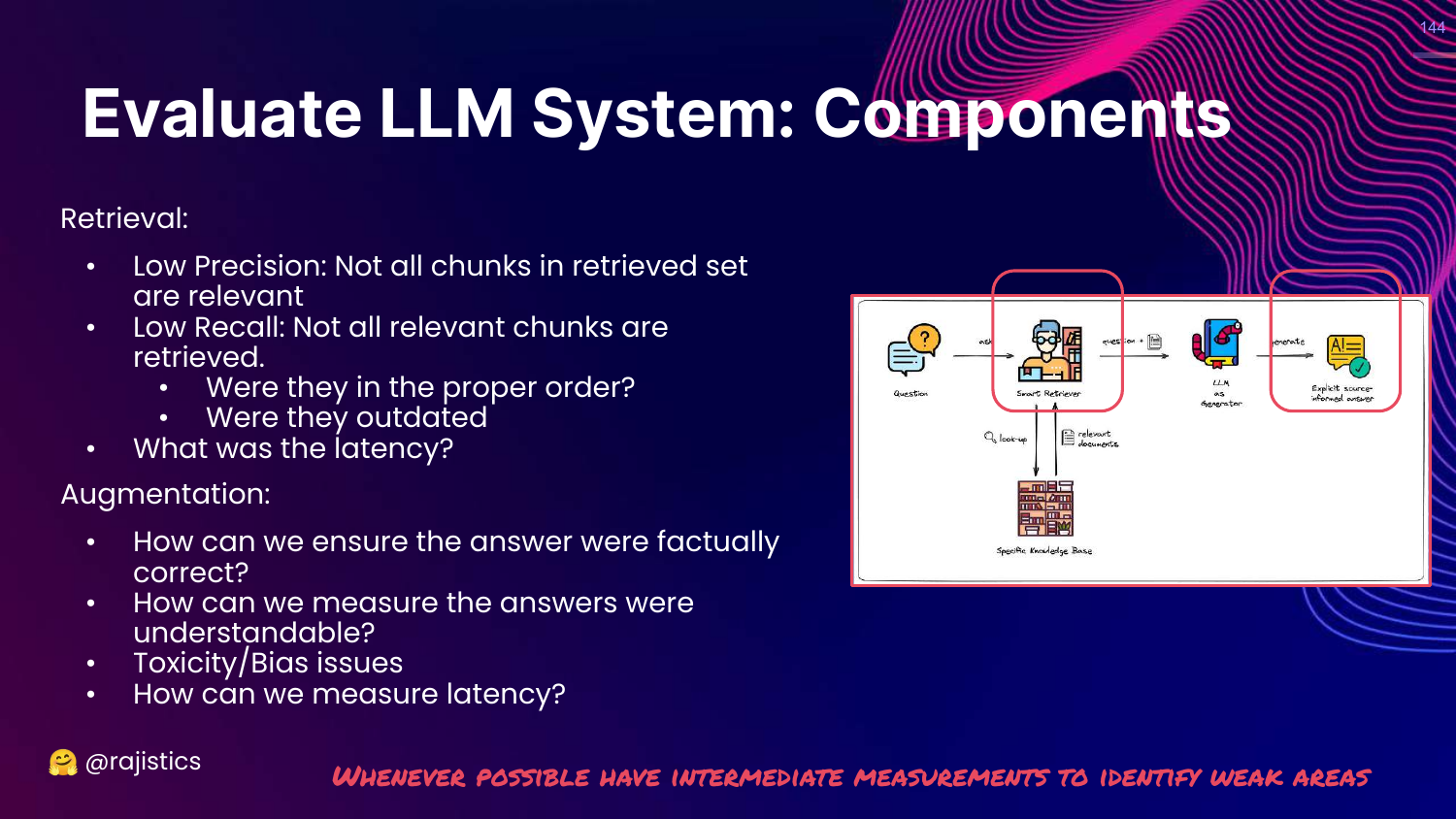 Rajiv argues we must evaluate these independently to find the bottleneck. Often, the problem is the Retriever, not the LLM.