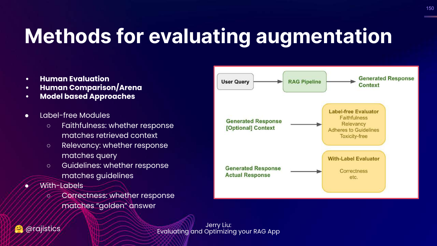 This slide details metrics for each component: * Retrieval: Precision, Recall, Order. * Augmentation: Correctness, Toxicity, Hallucination.