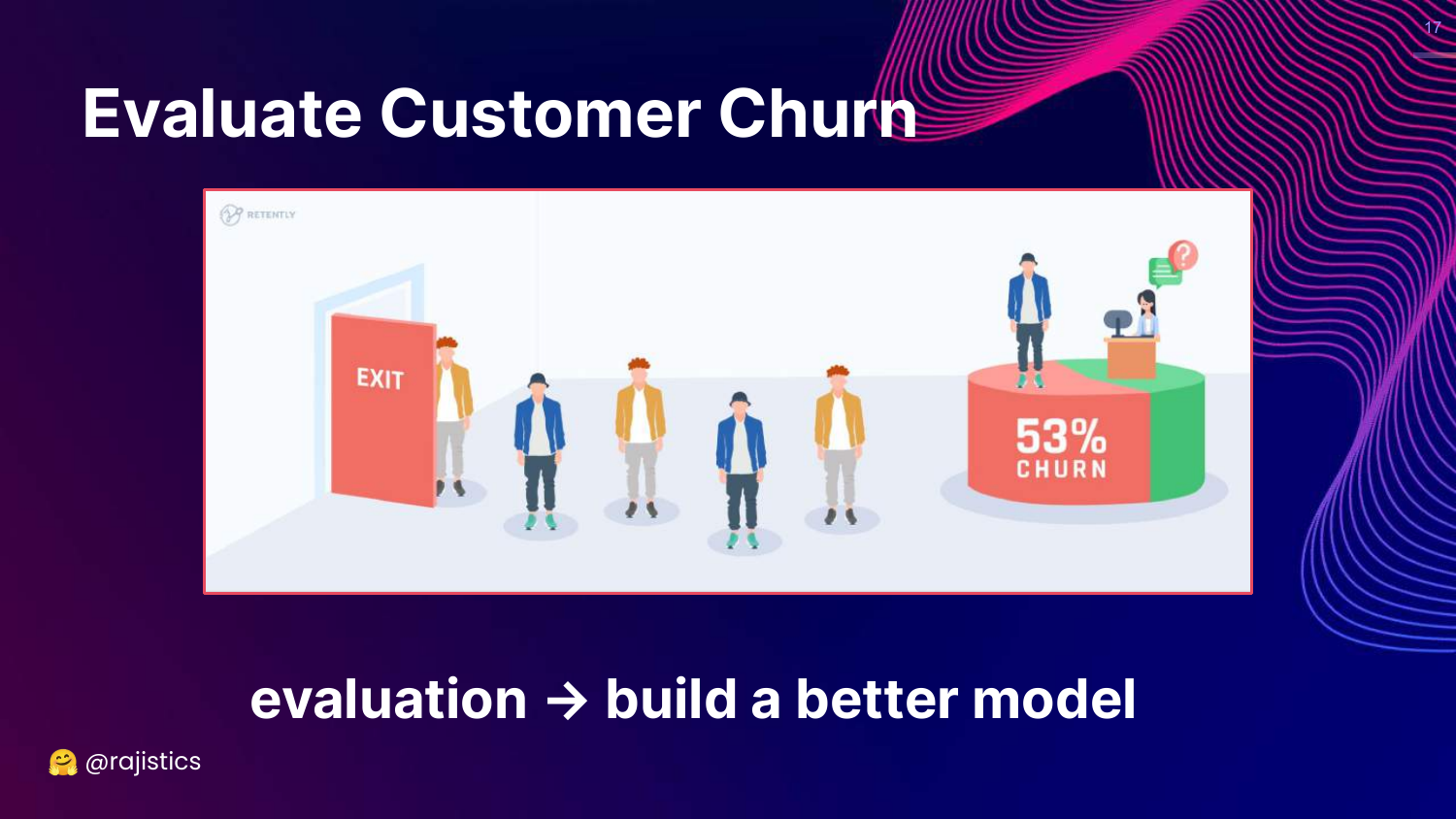 This slide introduces a classic “Data Science 101” problem: Customer Churn. It depicts an exit door and a pie chart, setting up a scenario where a data scientist must evaluate a model designed to predict which customers will leave.