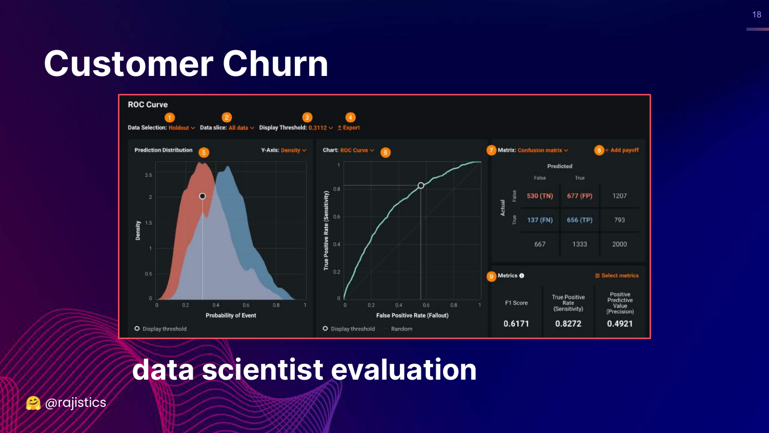 This slide shows standard classification metrics: ROC curve, Confusion Matrix, F1 Score, and True Positive Rate. Rajiv labels this as the “Junior Data Scientist” approach.