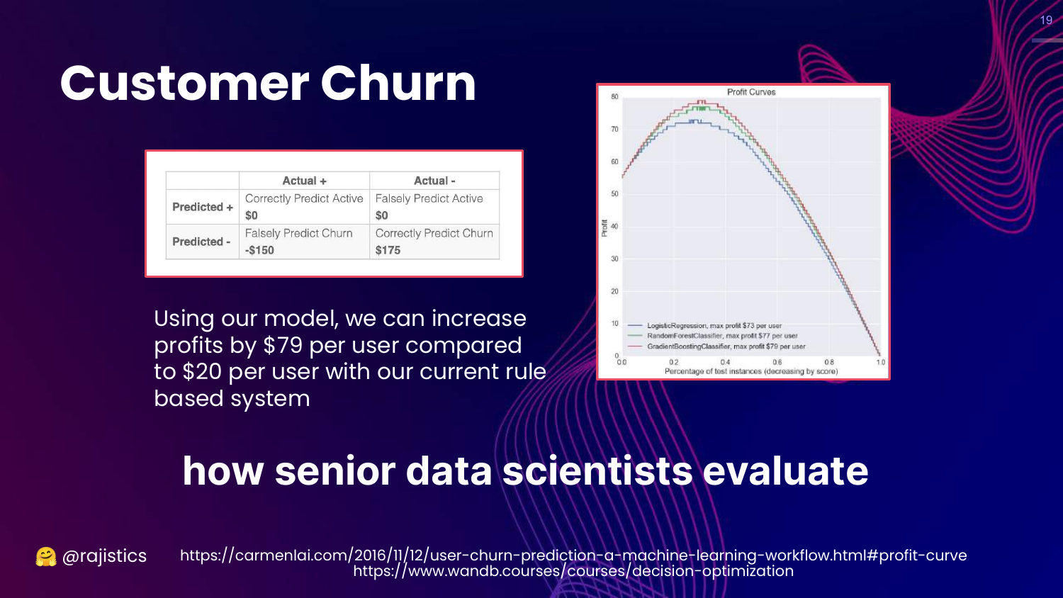 This slide introduces Profit Curves. It translates the confusion matrix into dollar values (cost of false positives vs. value of true positives). Rajiv calls this the “Senior Data Scientist” approach.