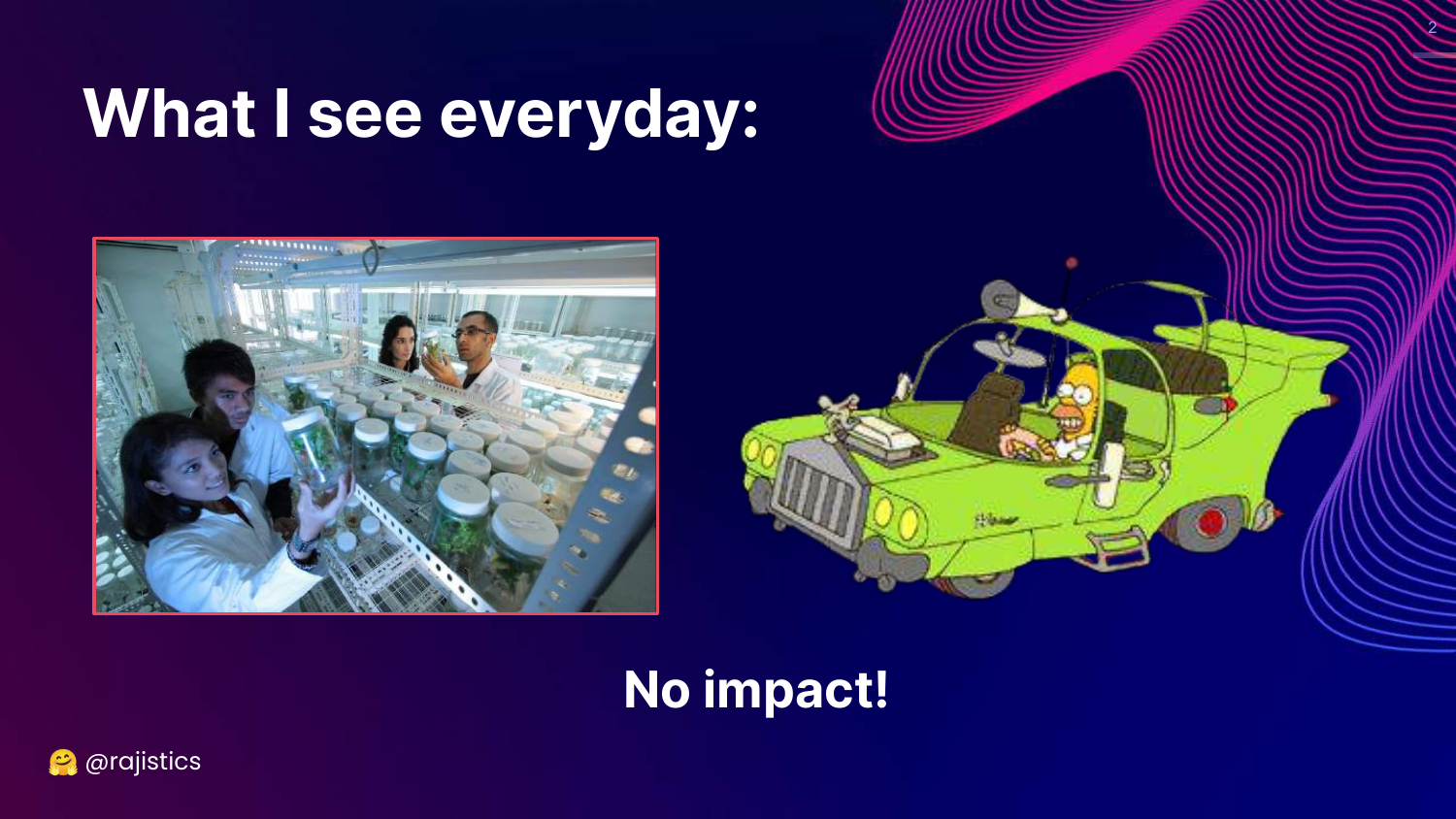 This slide humorously illustrates the current state of many LLM projects. It depicts a chaotic lab scene and a cartoon character in a strange vehicle, captioned “No impact!” This visualizes the frustration of data scientists building cool things that never deliver real-world value.