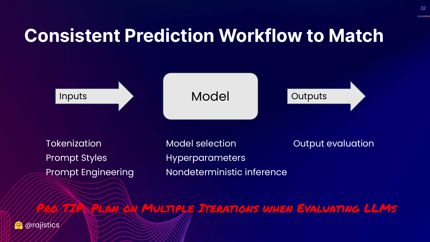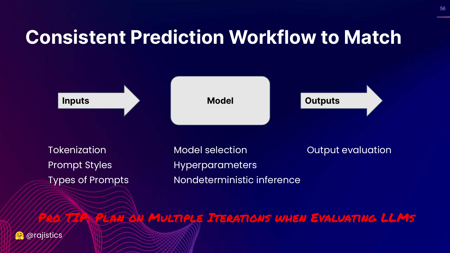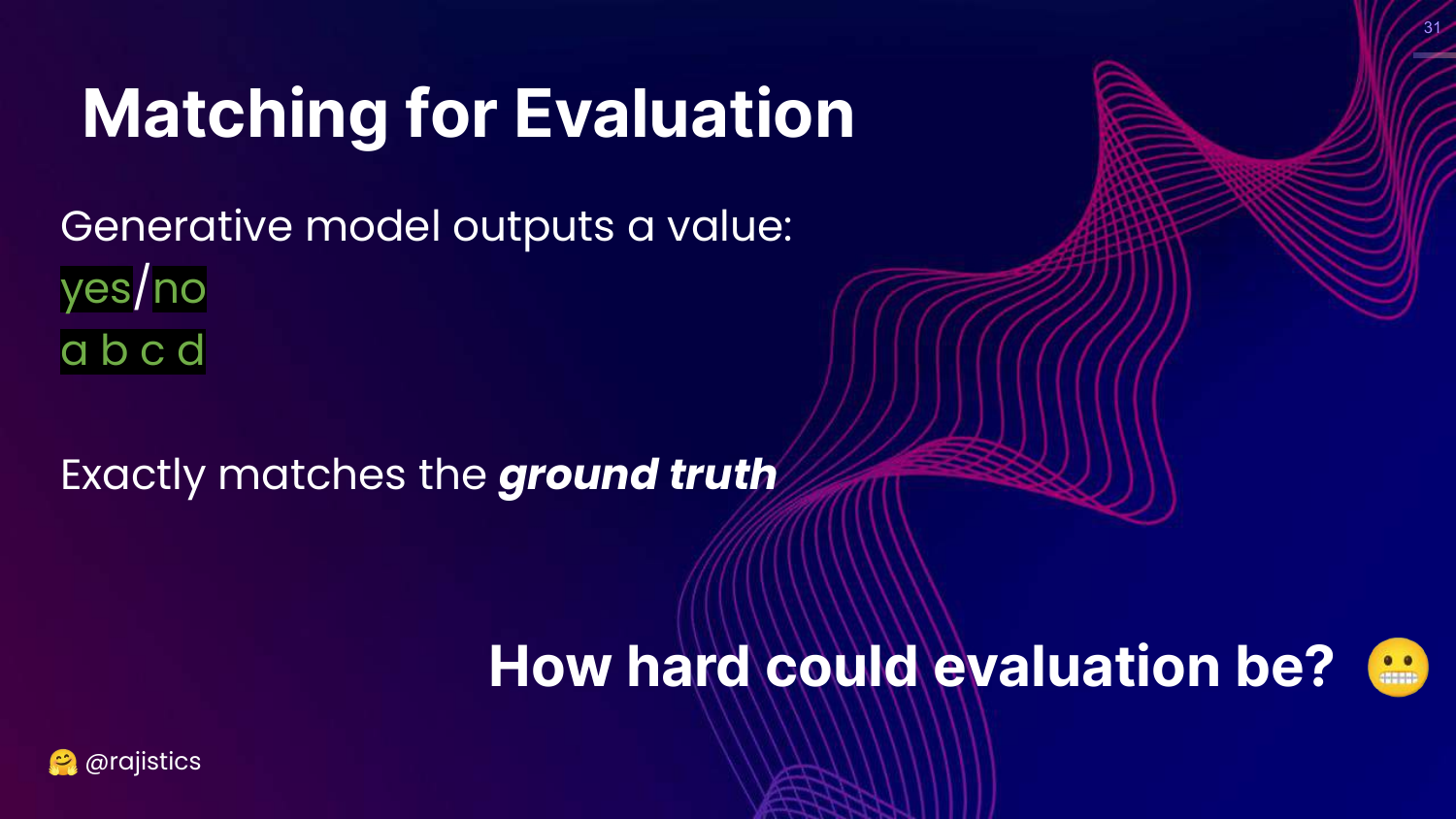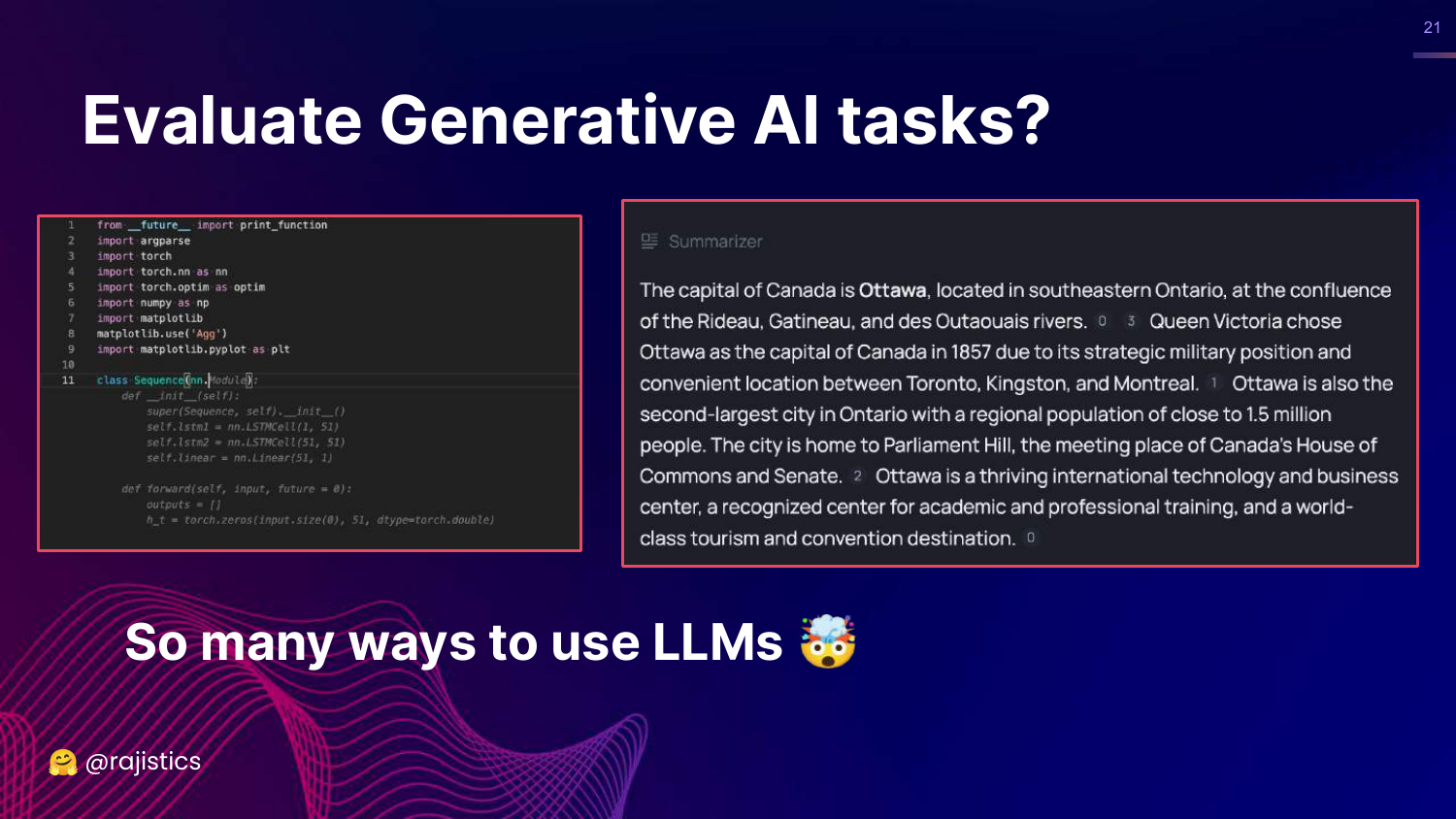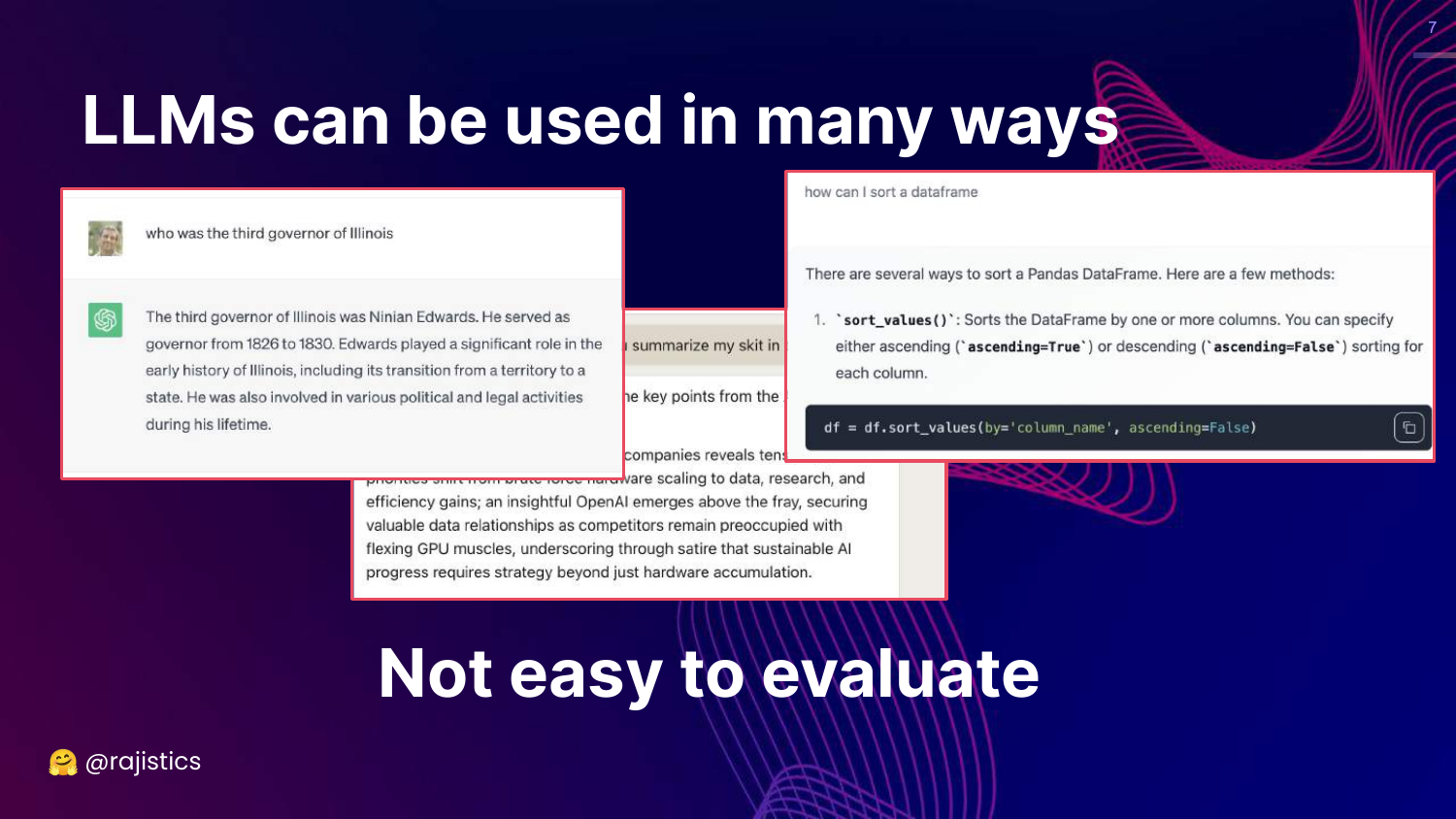 Rajiv explains that this versatility makes evaluation difficult. Unlike traditional ML where a simple confusion matrix might suffice, LLMs produce varied, open-ended outputs that require more complex assessment strategies.