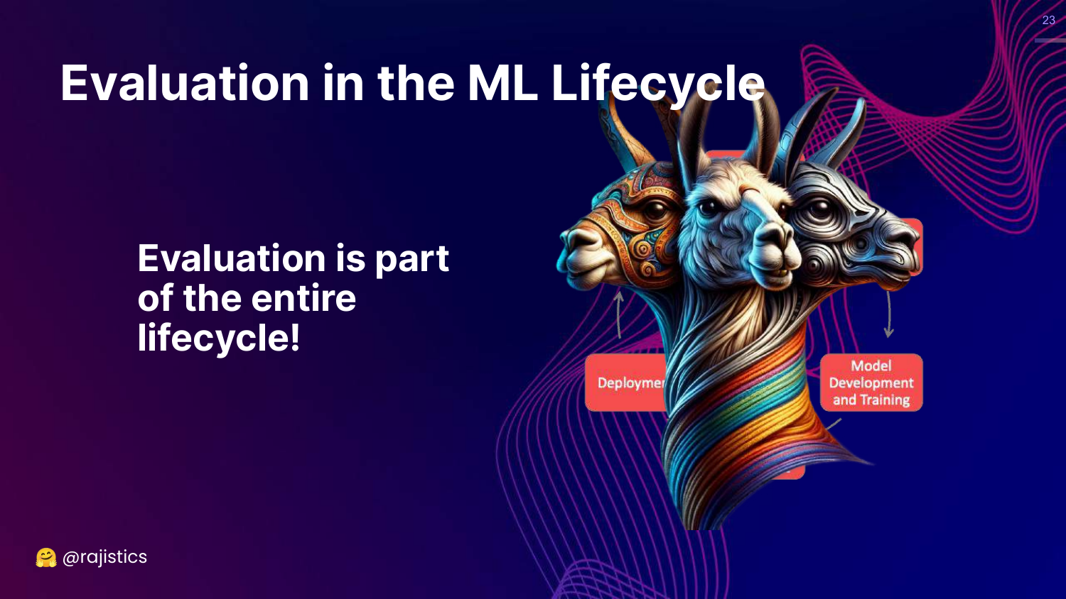 Rajiv explains that evaluation is not a one-time step. It happens: 1. Before: To decide if a project is viable. 2. During: To train and tune the model. 3. After: To monitor the model in production (Monitoring is the “sibling” of Evaluation).