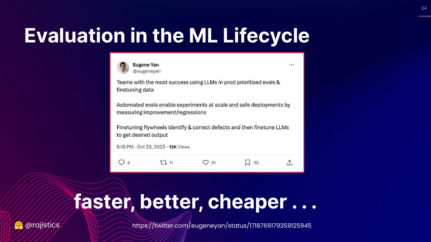This slide features a tweet by Eugene Yan, stating that automated evaluations lead to “faster, better, cheaper” LLMs. It mentions that good eval pipelines allow for safer deployments and faster experiments.