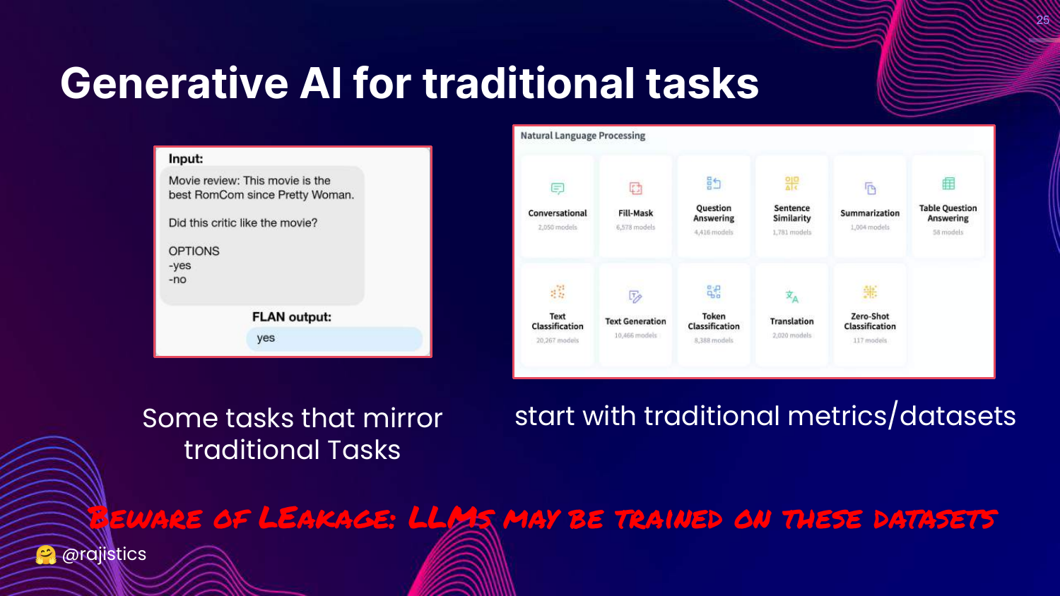 This slide advises that if you are using GenAI for a traditional NLP task (like sentiment analysis), you should “start with traditional metrics/datasets.”