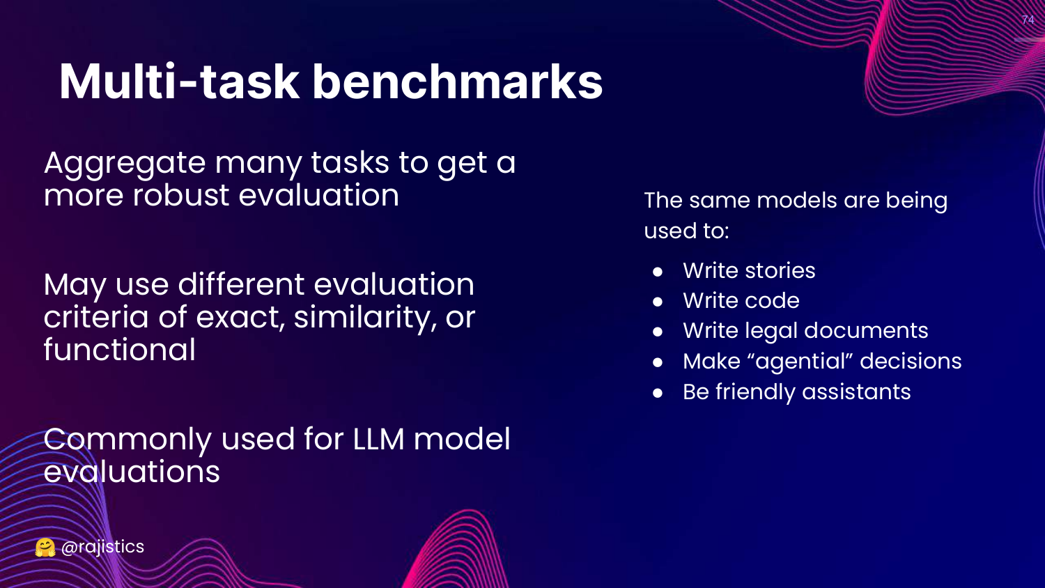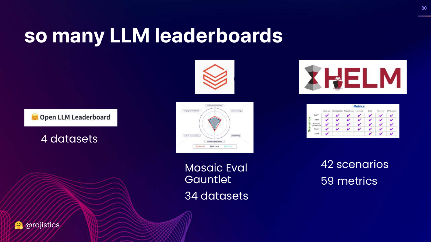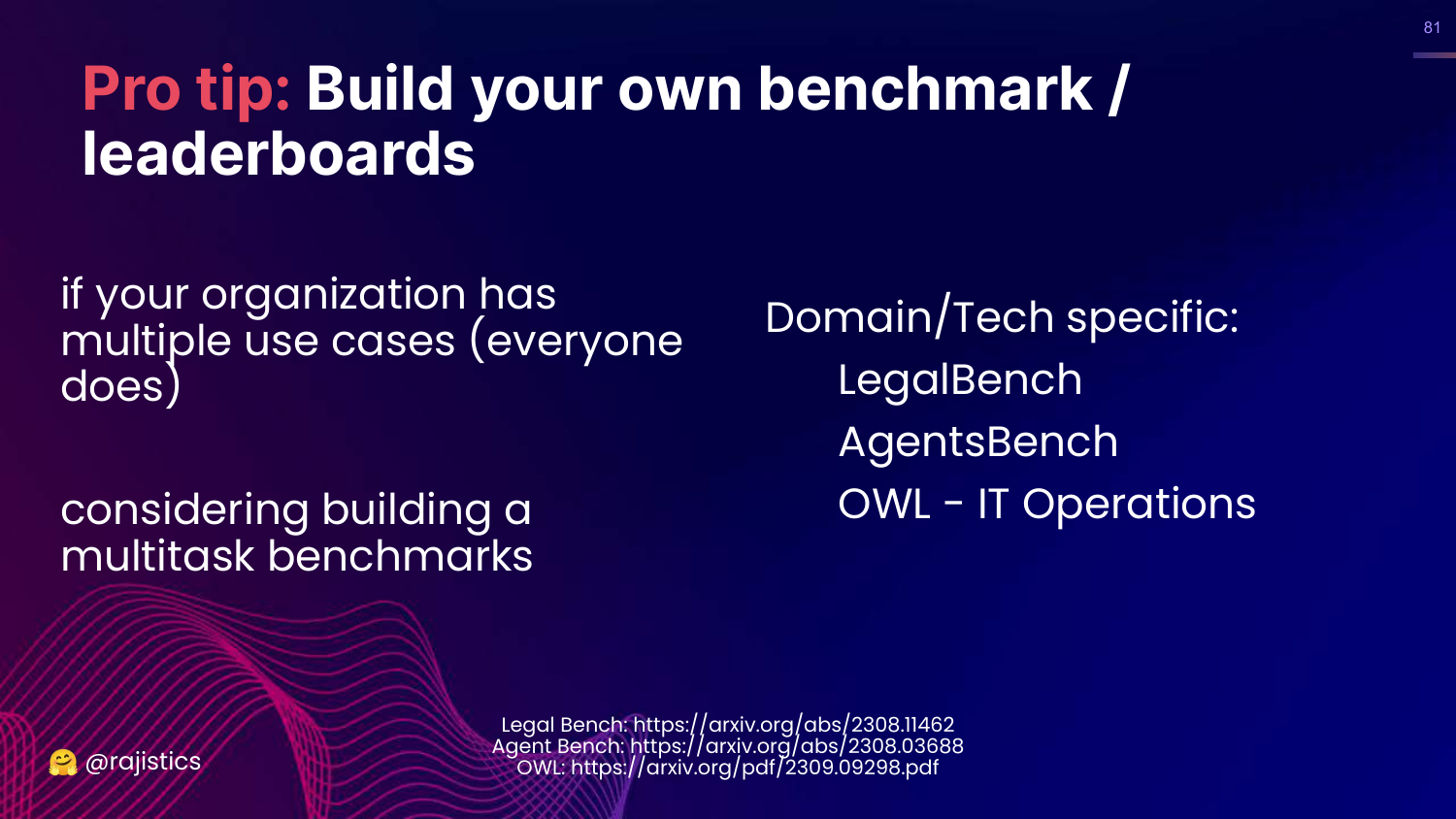 Rajiv explains that most public benchmarks focus on the former—comparing thousands of models. However, in enterprise settings, the goal is usually the latter: you pick a model (like GPT-4 or Llama 2) and need to evaluate how to optimize it for your specific application.