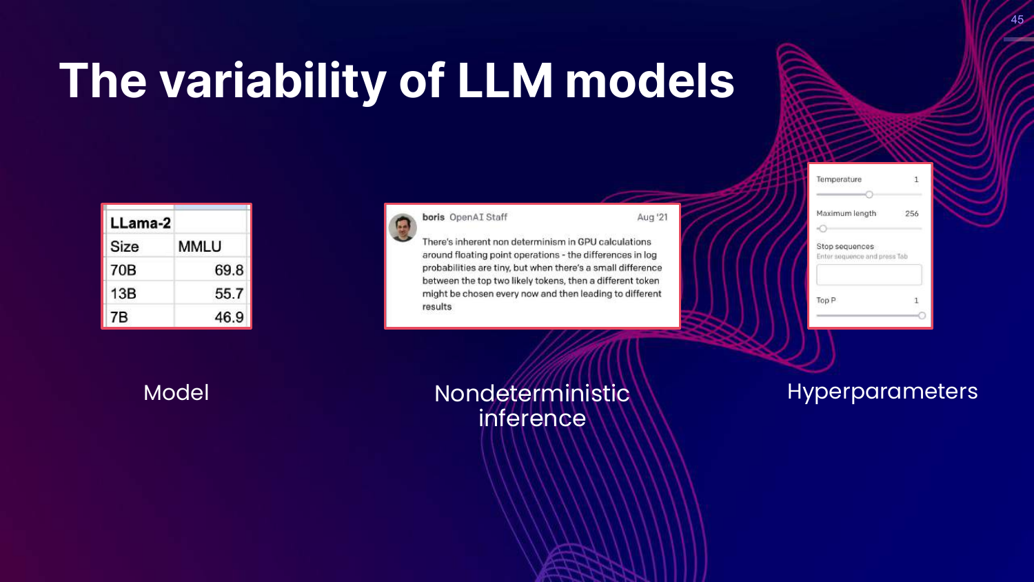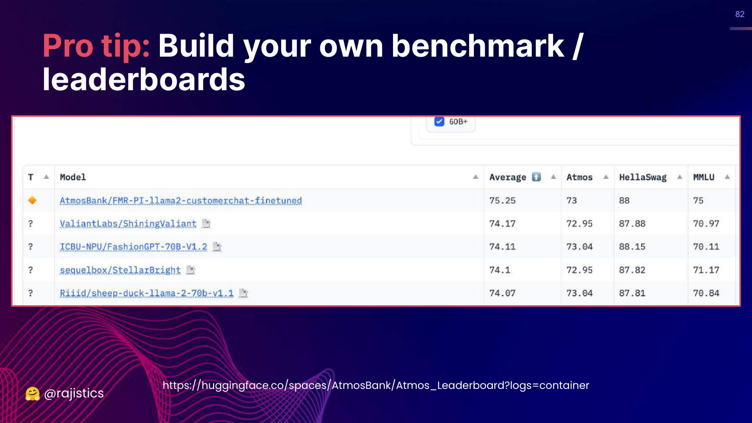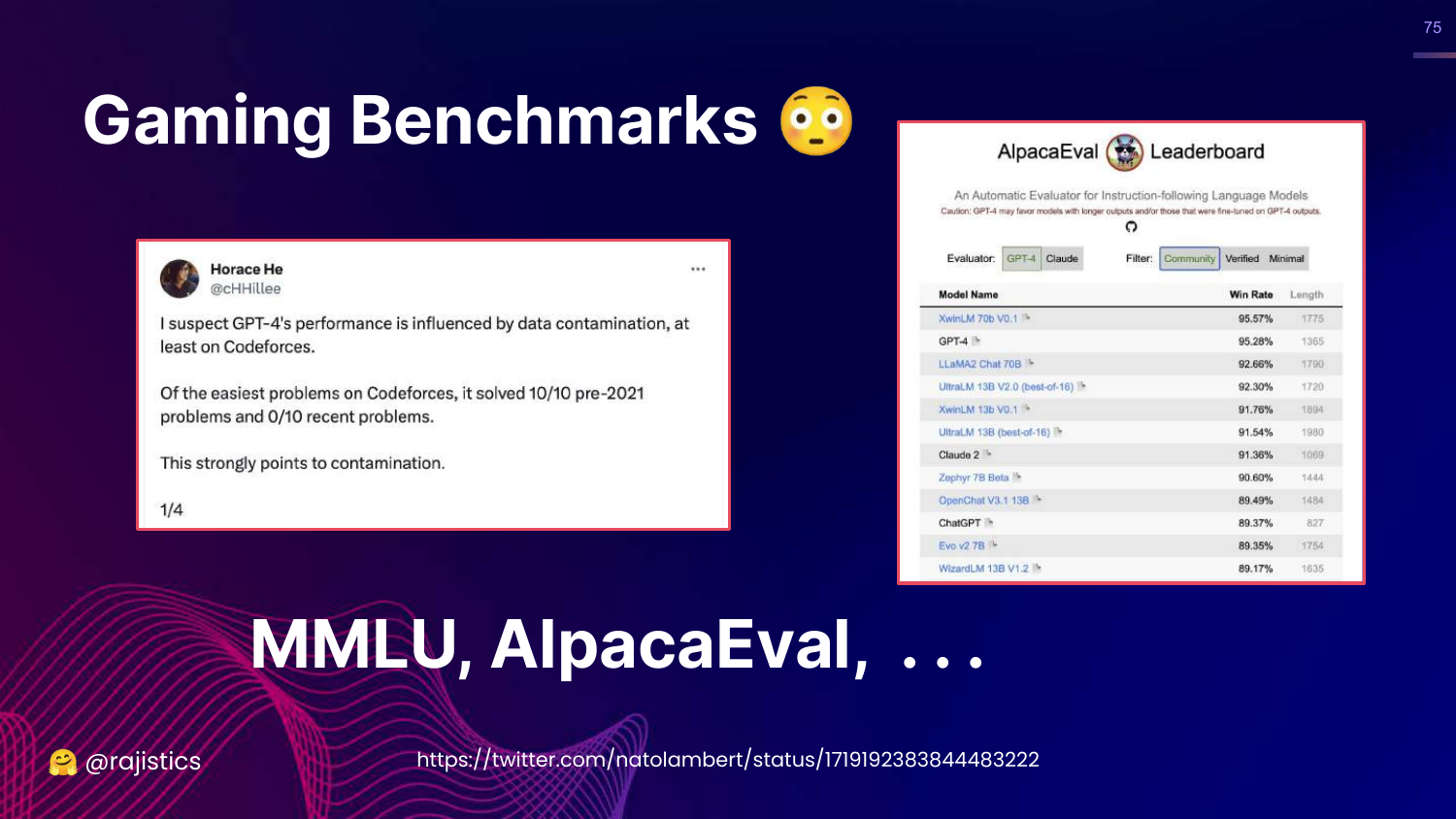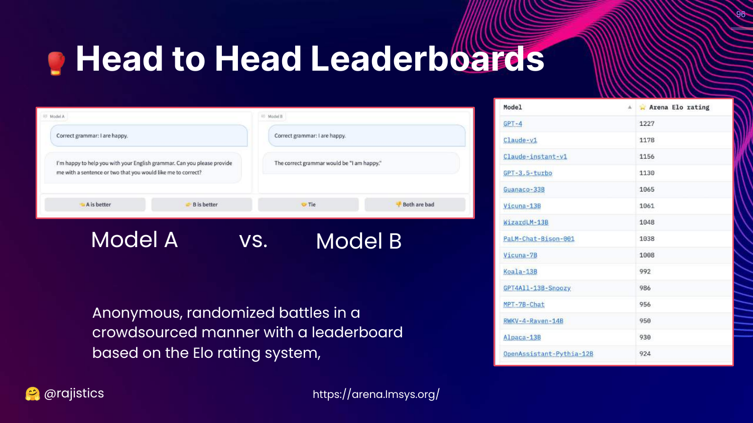 Rajiv explains that most public benchmarks focus on the former—comparing thousands of models. However, in enterprise settings, the goal is usually the latter: you pick a model (like GPT-4 or Llama 2) and need to evaluate how to optimize it for your specific application.