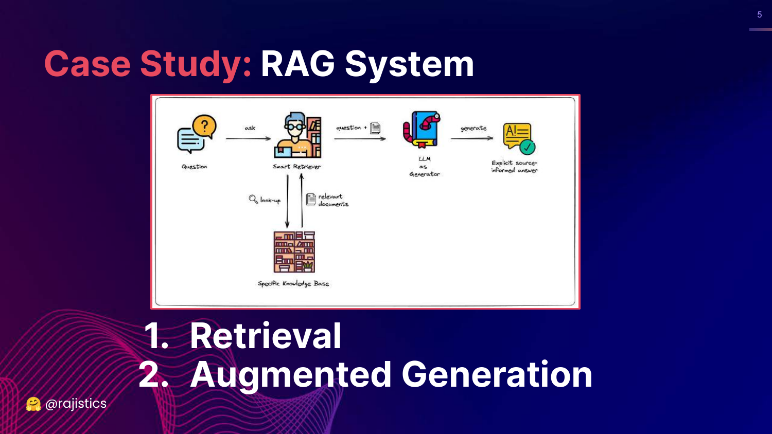 This slide previews the case study at the end of the talk: Retrieval Augmented Generation (RAG). It shows a diagram splitting the RAG process into two distinct components: Retrieval (finding the data) and Augmented Generation (synthesizing the answer).