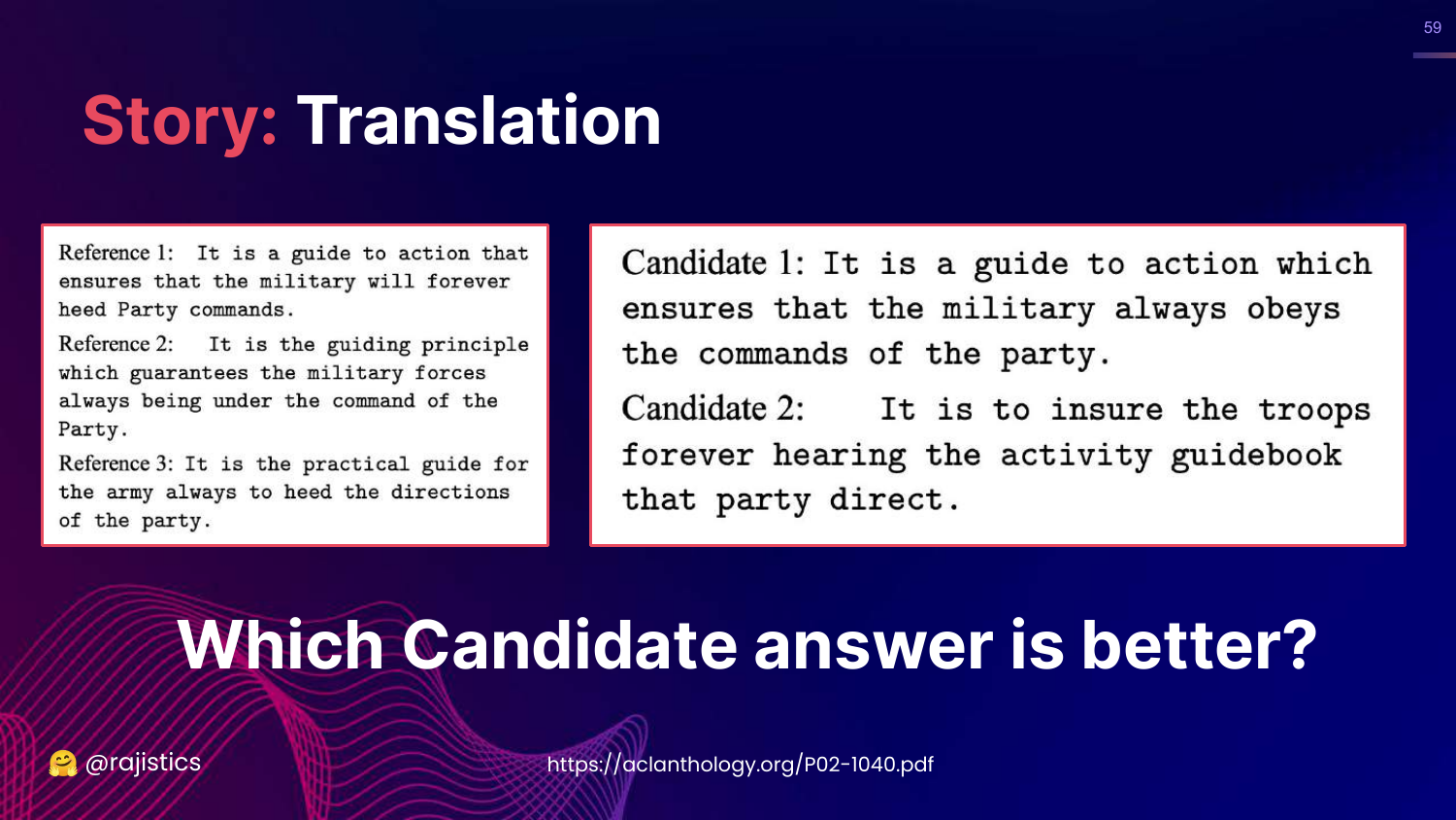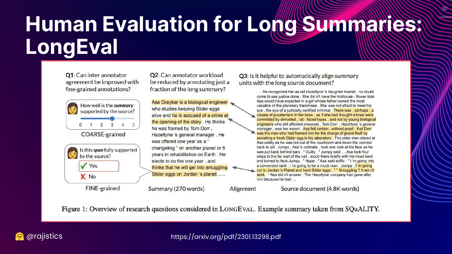 For generation, exact match doesn’t work. We need flexible evaluators (Humans or LLMs) to judge faithfulness and relevancy.