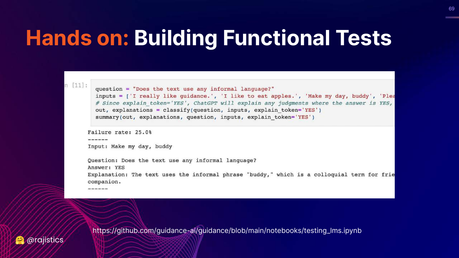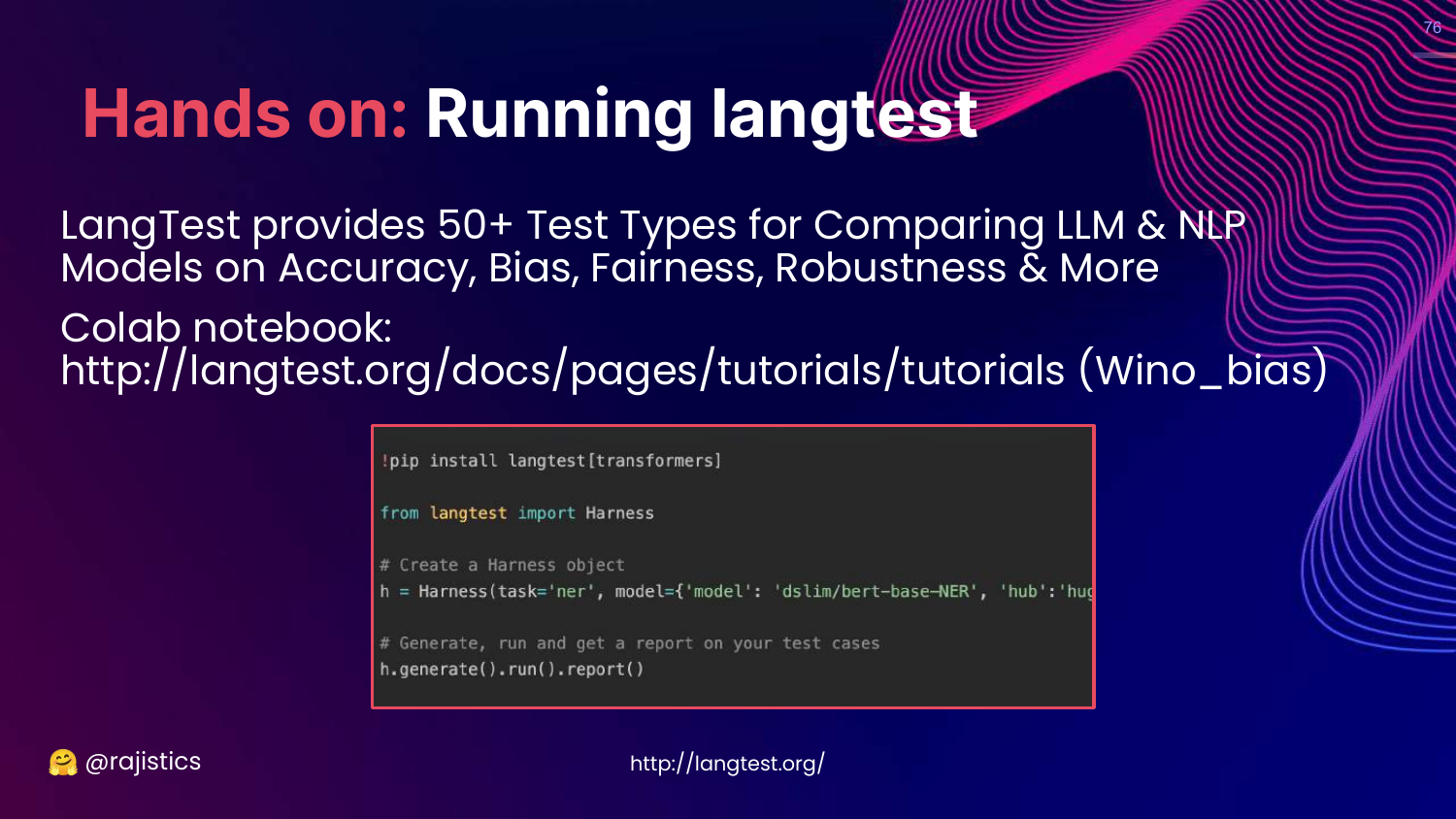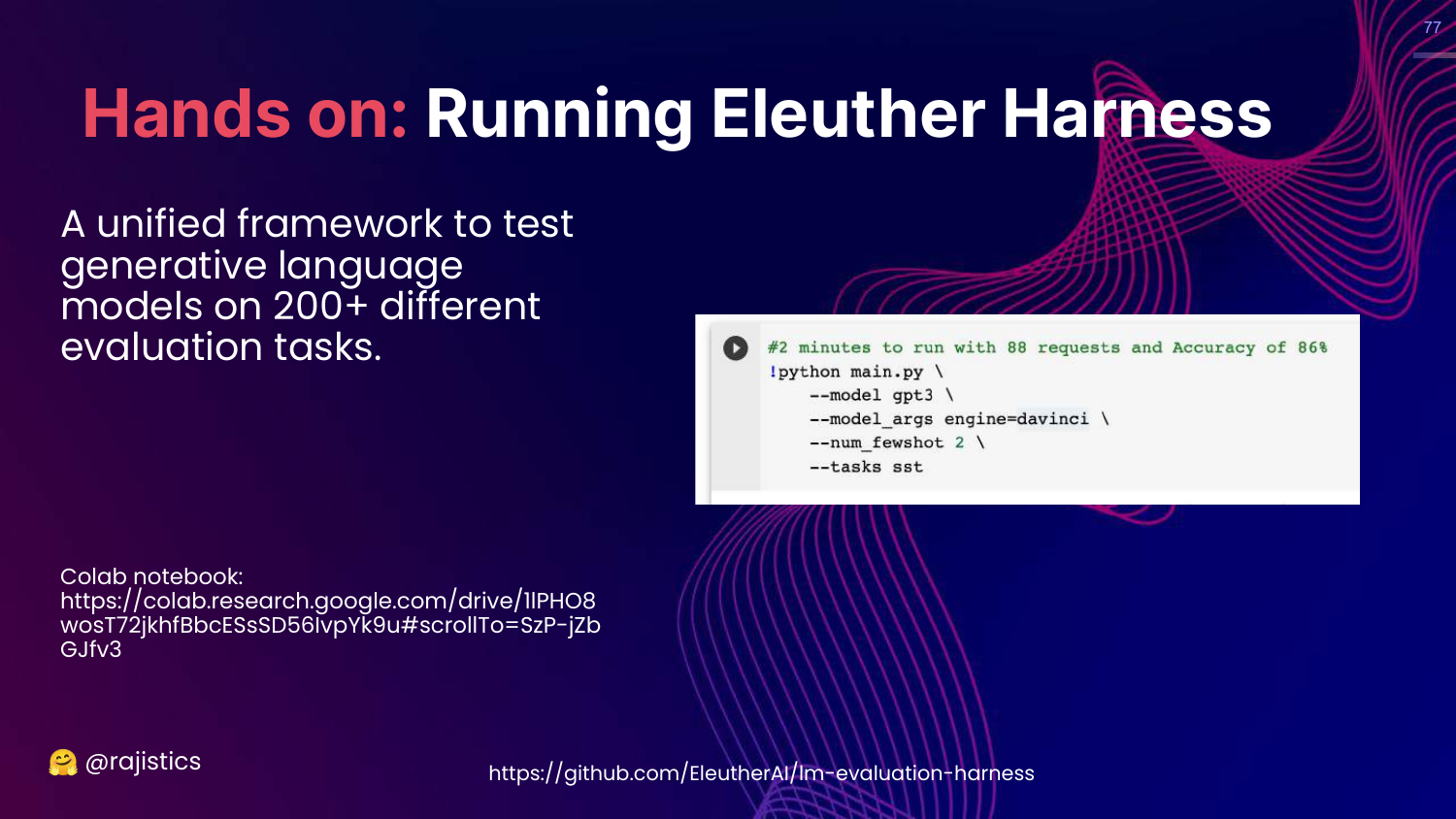 This slide lists the notebooks available in the GitHub repo: Prompting, Guidance, Eleuther Harness, Langtest, Ragas.