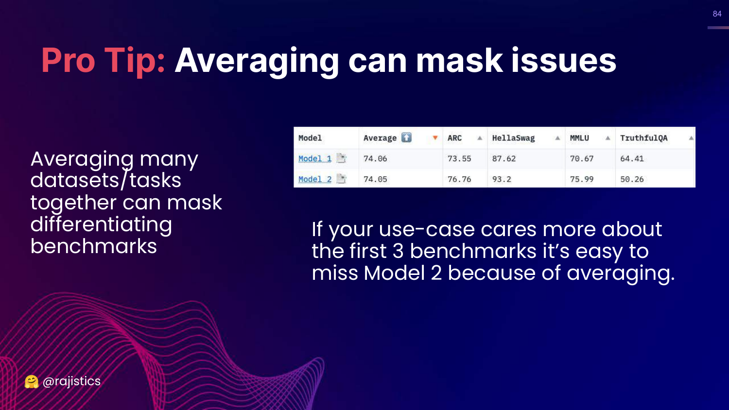 Rajiv argues that if a model’s high ranking is driven primarily by its performance on a dataset like TruthfulQA, it might not be relevant to a user whose use case (e.g., summarizing financial documents) has nothing to do with that specific benchmark.