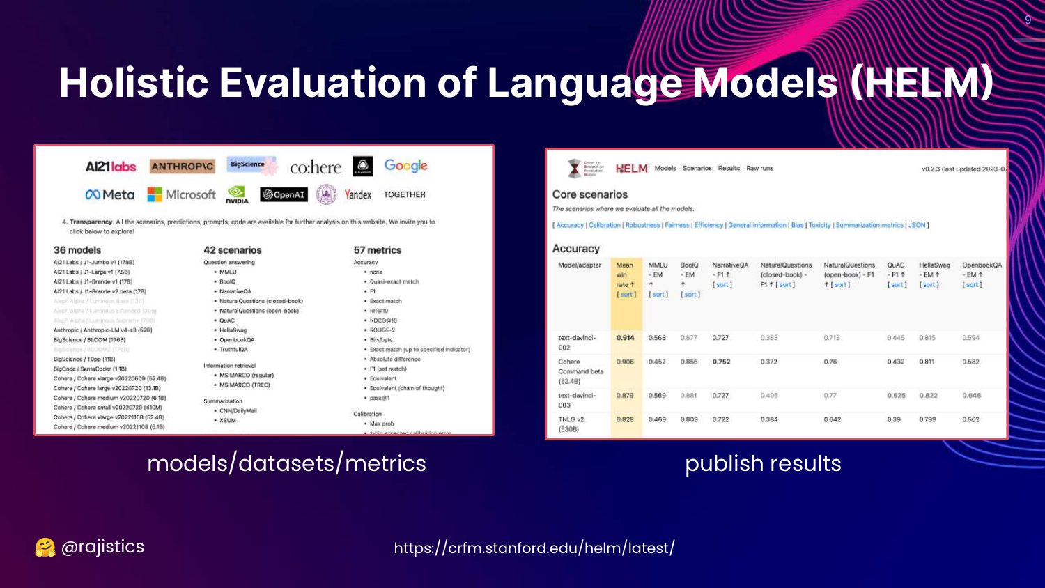 This slide introduces HELM (Holistic Evaluation of Language Models) from Stanford. It displays the framework’s structure, which evaluates models across various scenarios (datasets) and metrics (accuracy, bias, toxicity).