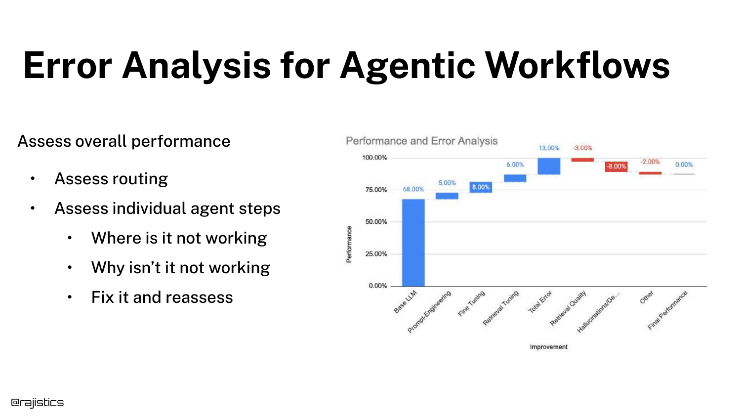 Error Analysis for Agentic Workflows requires assessing the overall performance, the routing decisions, and the individual steps.