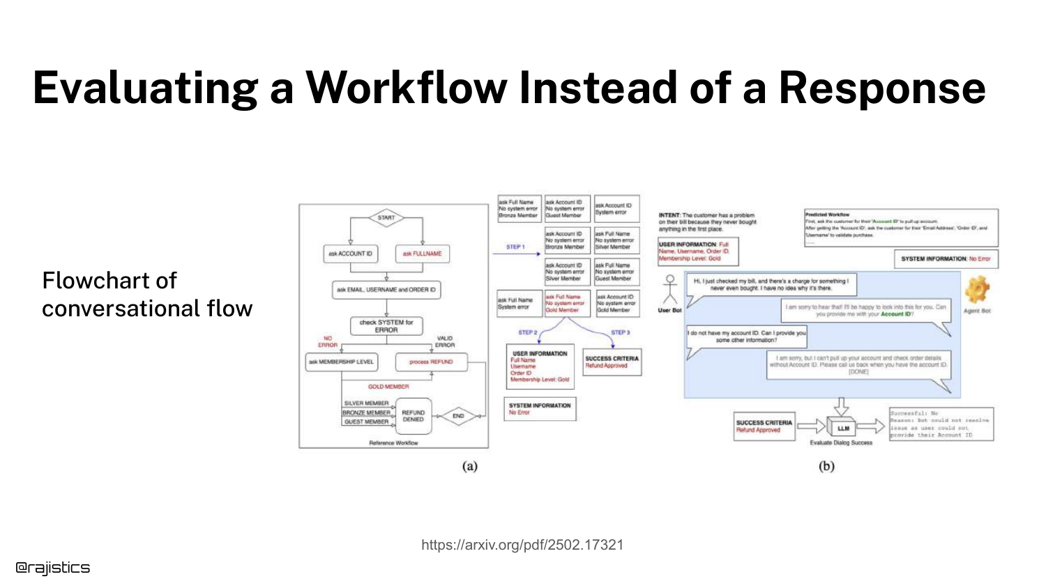 This slide distinguishes between evaluating a Response (text) and a Workflow (process). The flowchart shows a conversational flow.
