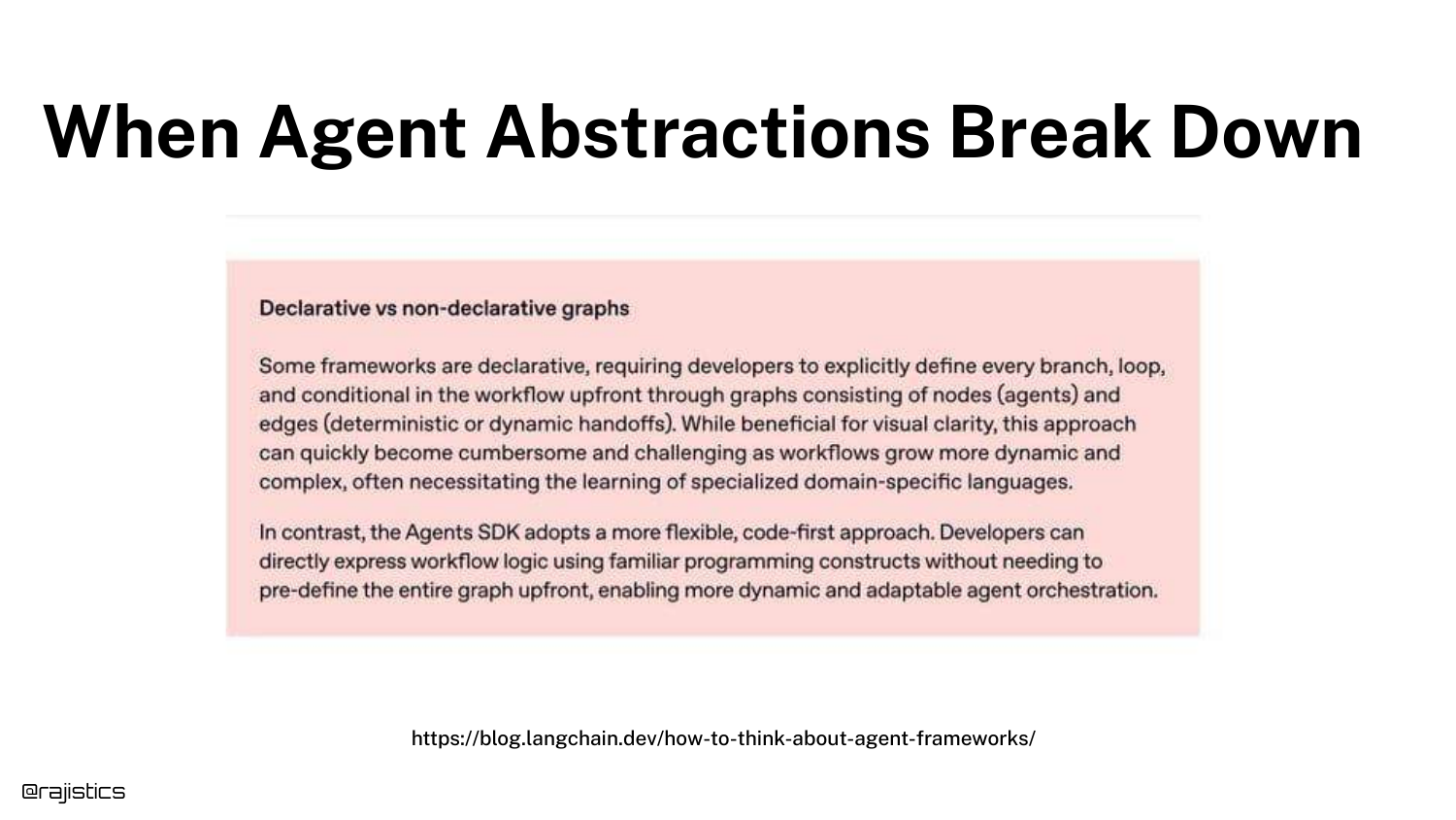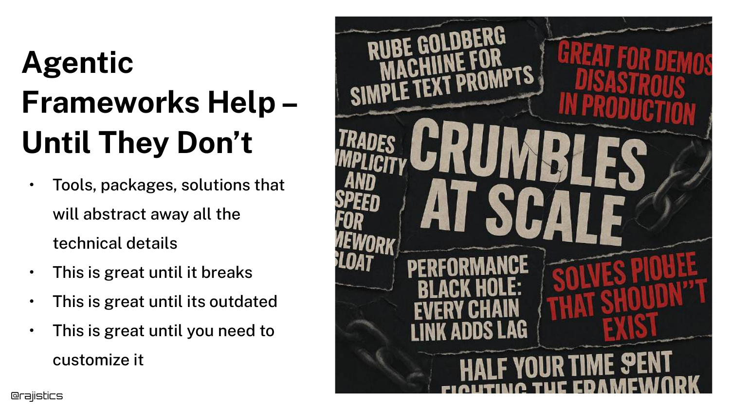 Rajiv warns that “Agentic Frameworks Help – Until They Don’t.” Frameworks (like LangChain or AutoGen) are great for demos because they abstract complexity.