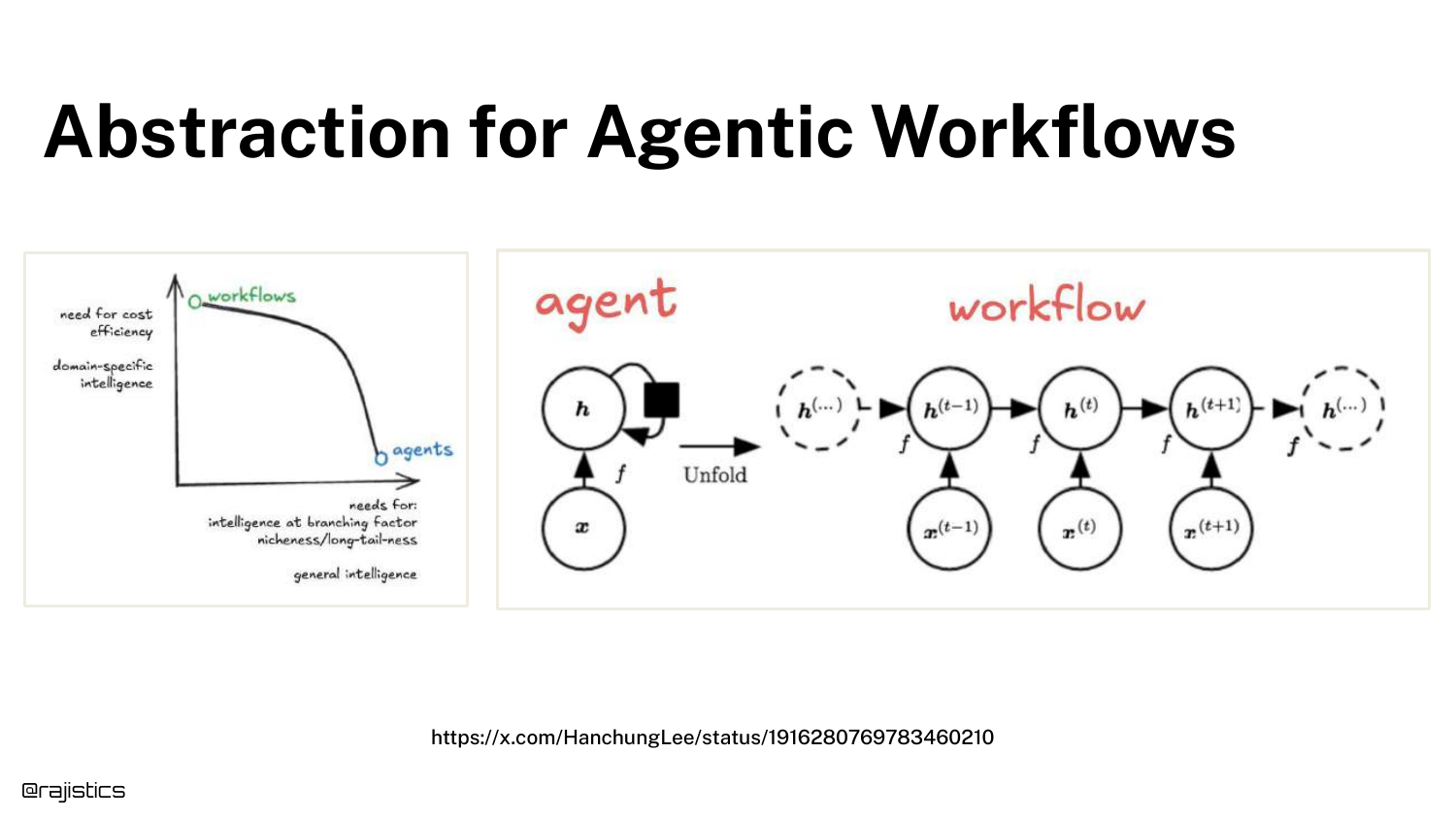 The slide illustrates the trade-off in Abstraction. You can build rigid workflows (orchestration) where you control every step, or use general agents where the LLM decides.
