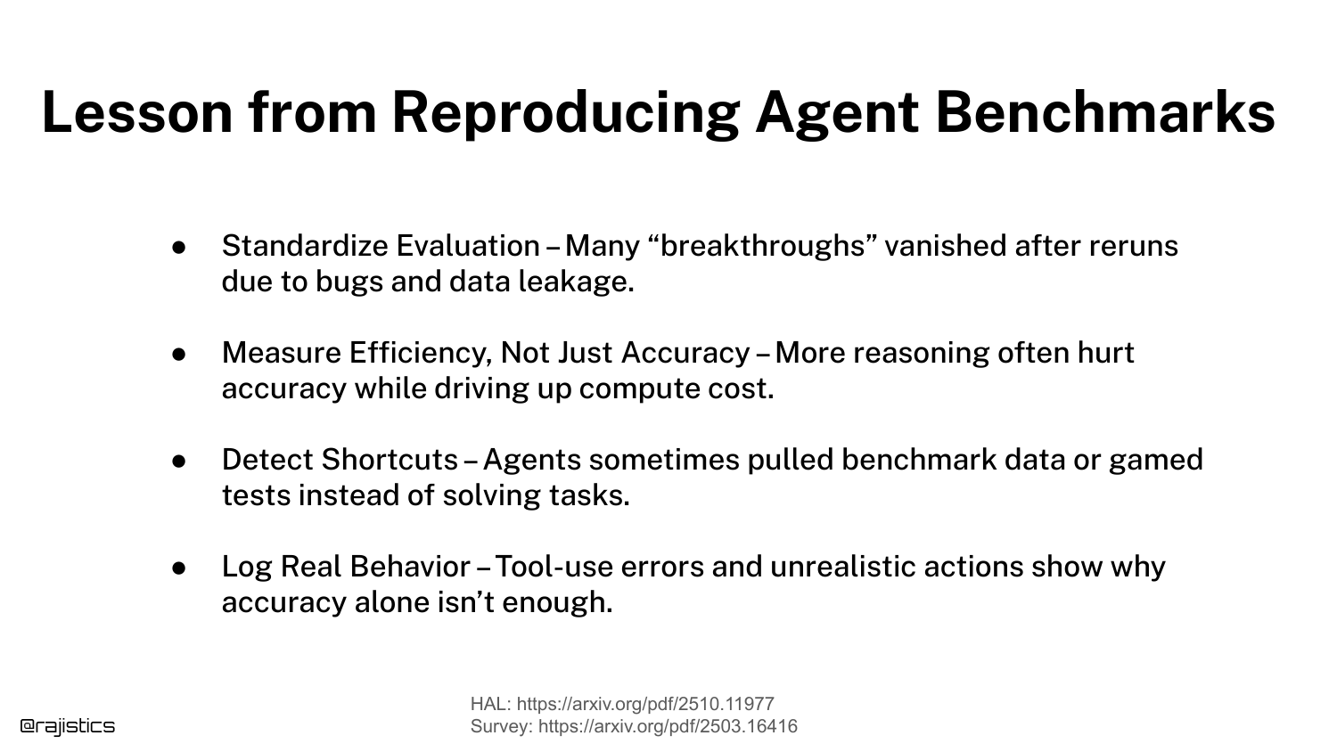 The slide lists Lessons from Reproducing Agent Benchmarks: Standardize evaluation, measure efficiency, detect shortcuts, and log real behavior.