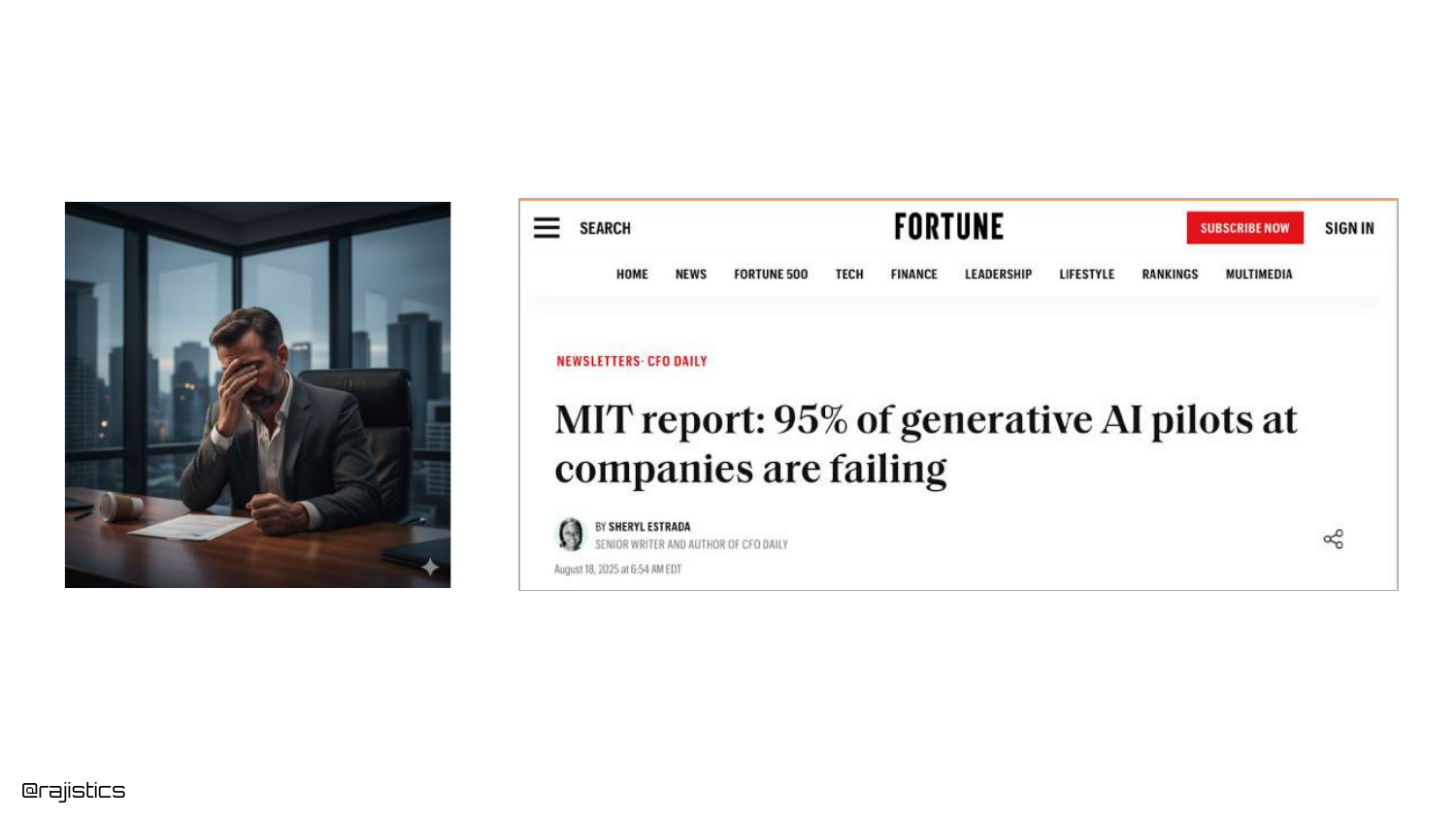 The slide cites an MIT report stating that “95% of GenAI pilots are failing.” While Rajiv notes this number might be overstated, it reflects a trend where executives are demanding ROI and seeing lackluster results.