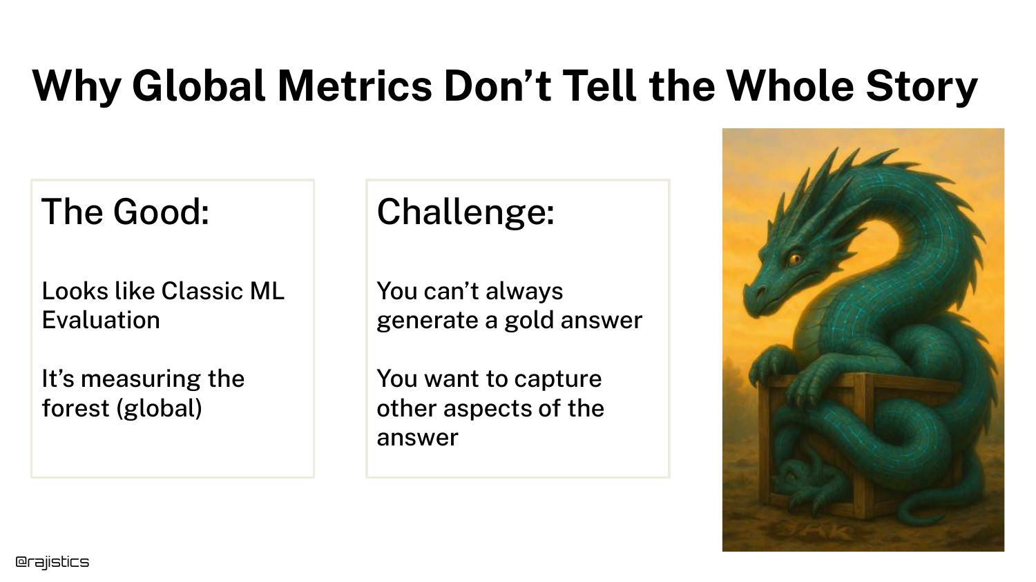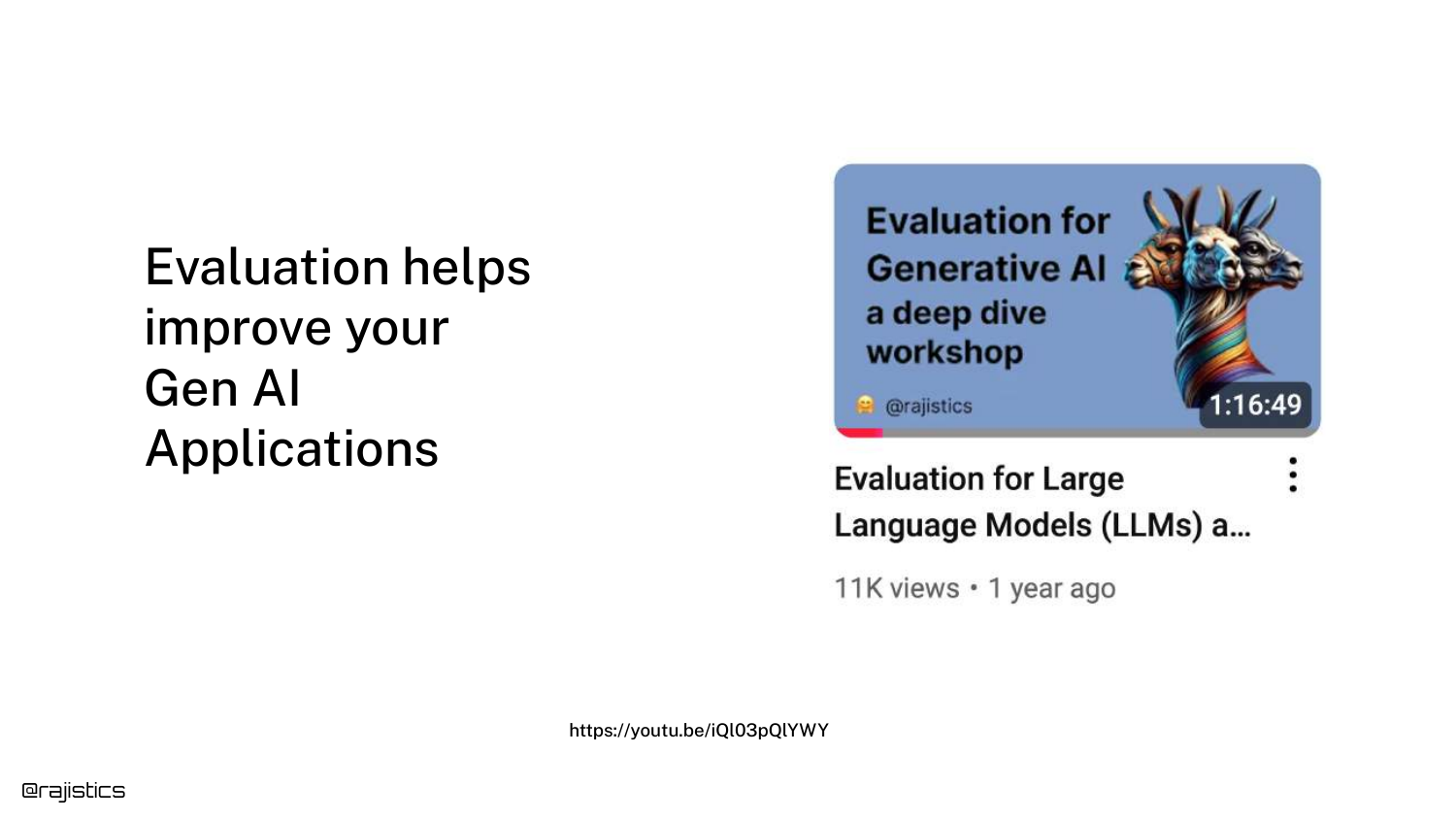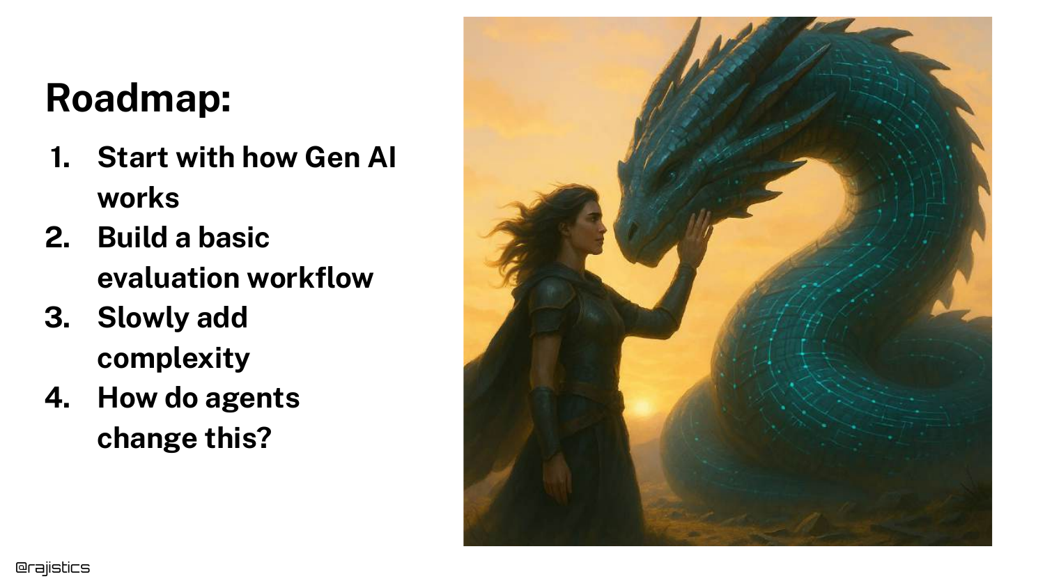 Rajiv sets the stage by outlining his three main goals for the session: understanding the technical differences in GenAI evaluation, learning a basic introductory workflow for building evaluation datasets, and inspiring practitioners to start “learning by doing” rather than just reading papers.