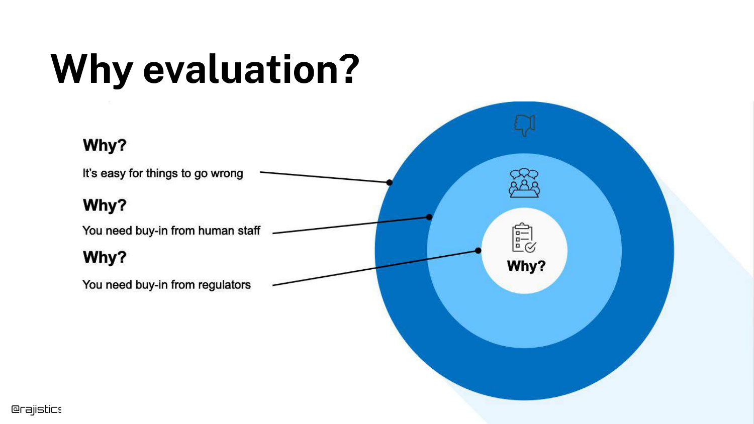 Evaluation serves multiple audiences: it helps the developer debug, it provides the metrics needed to convince management that the app is production-ready, and it creates the audit trails required by third-party auditors or regulators.