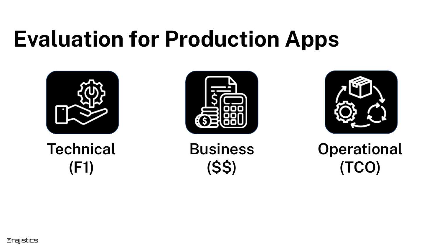 Evaluation must cover three dimensions: Technical (F1 scores, accuracy), Business (ROI, value generated), and Operational (Total Cost of Ownership, latency).