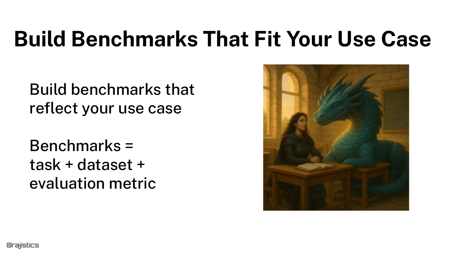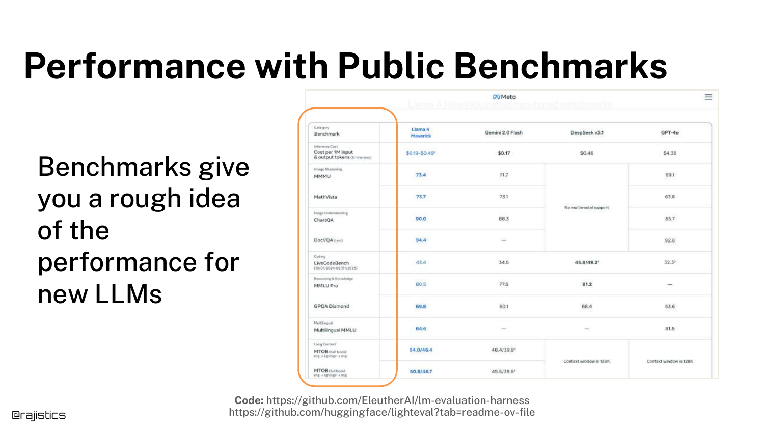 The slide discusses Public Benchmarks (like MMLU, GSM8K). While useful for a general idea of a model’s capabilities (e.g., “Is Llama 3 better than Llama 2?”), they are insufficient for specific applications.