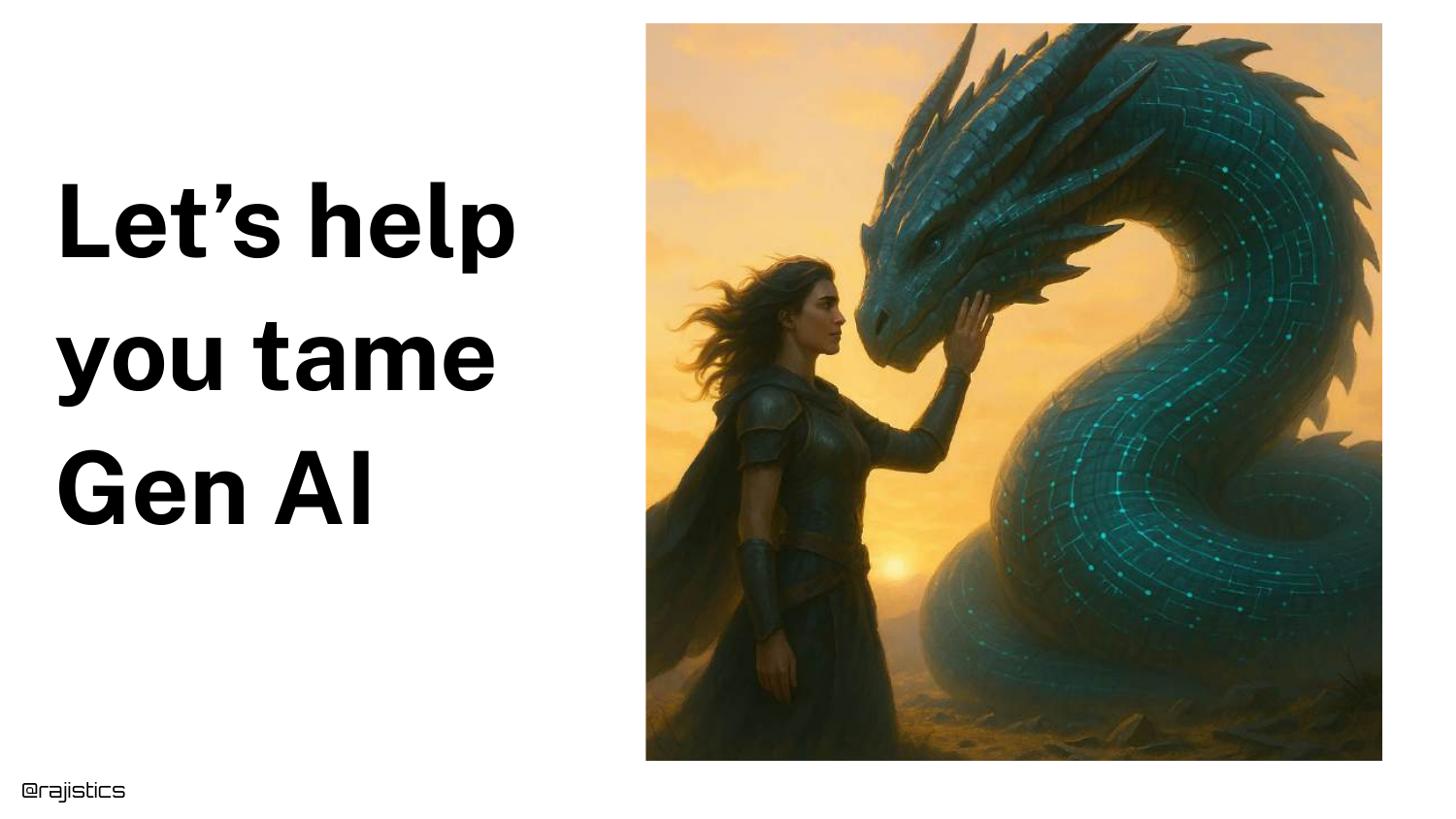 This title slide signals a transition into the technical “how-to” section of the talk. “Taming” implies that the default state of GenAI is wild and unpredictable.