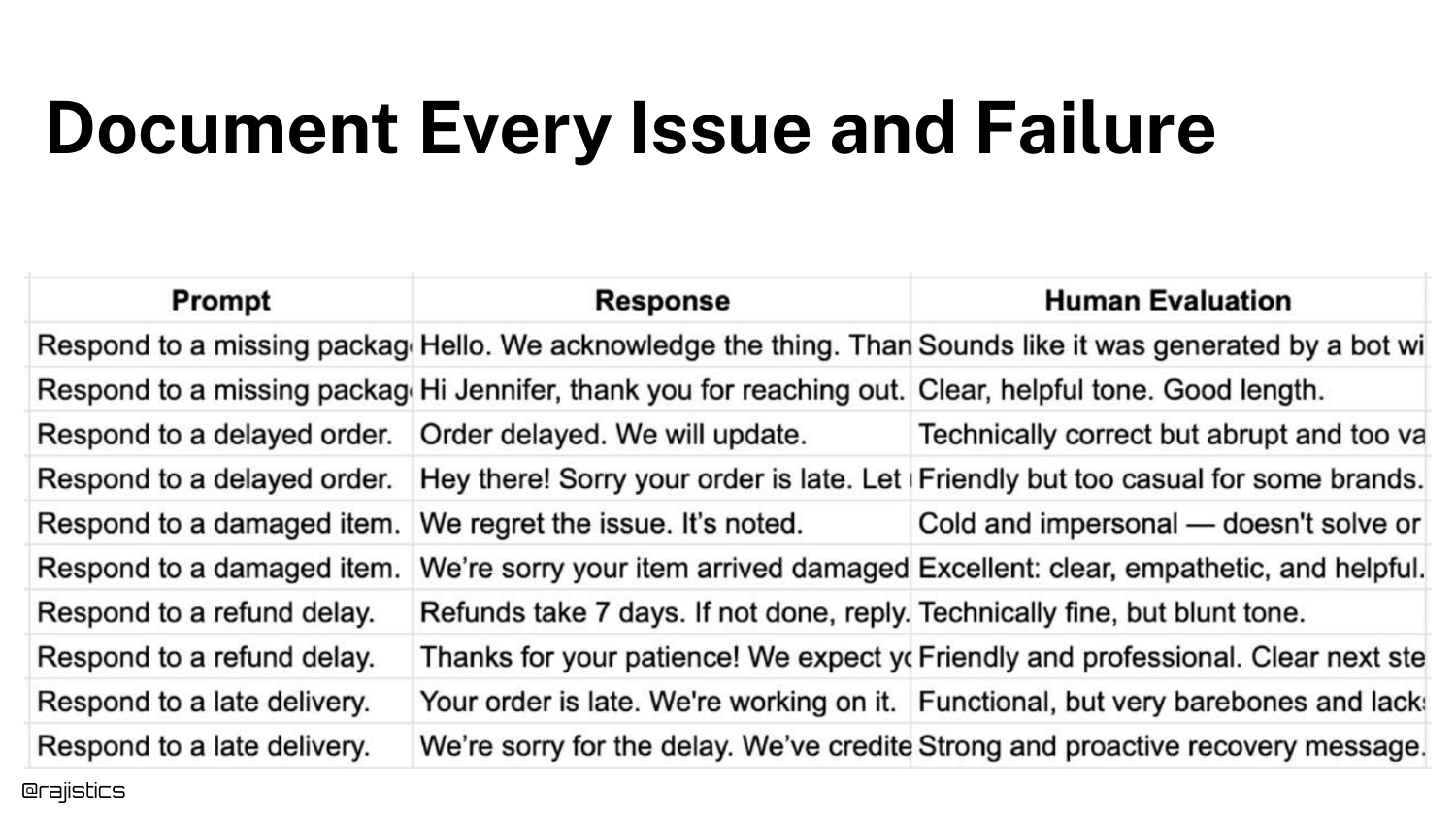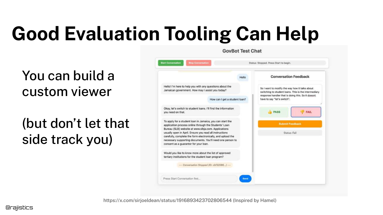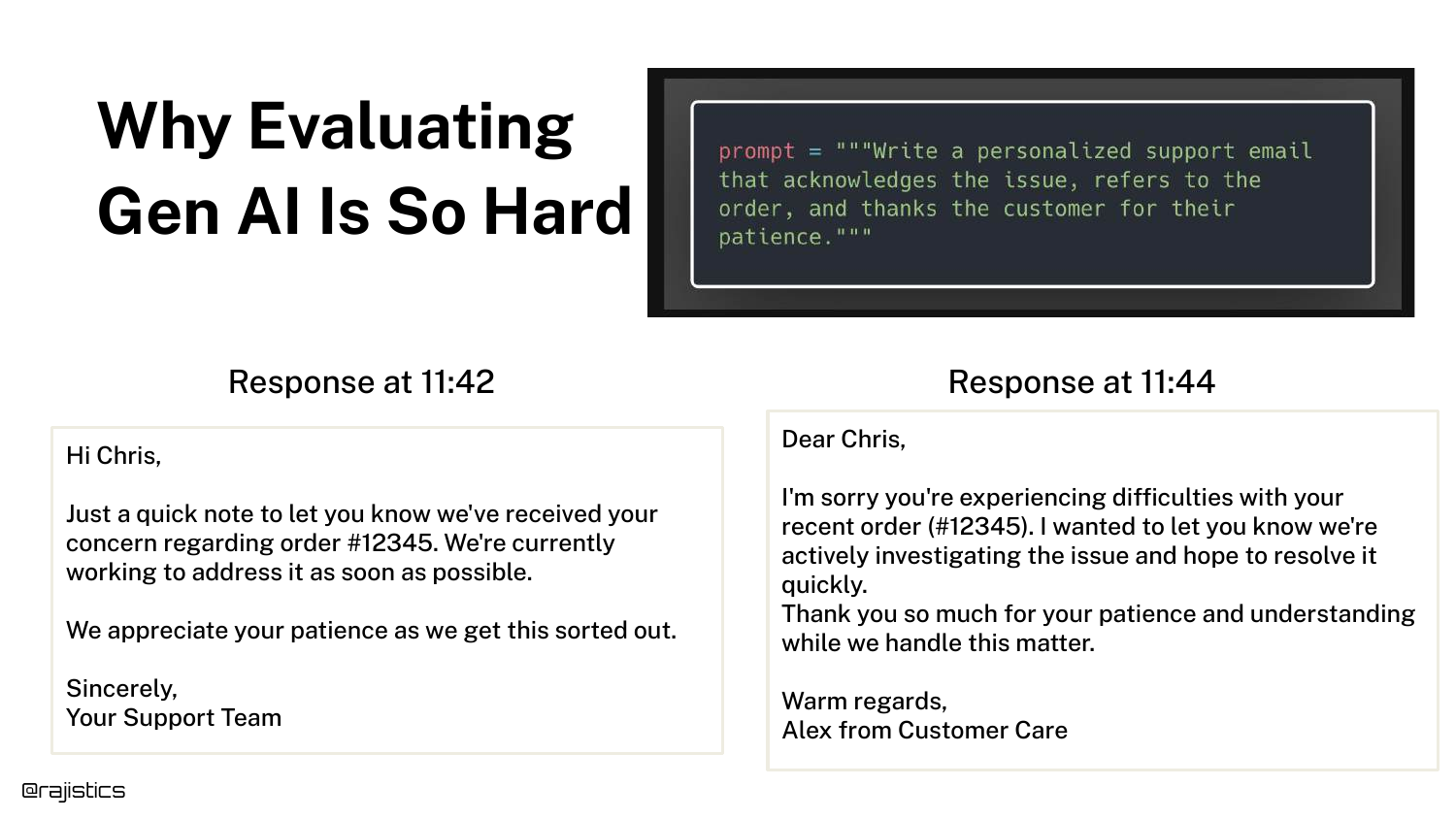 Rajiv explains that you cannot improve what you cannot measure. Without a robust evaluation framework, developers are essentially guessing whether changes to prompts or models are actually improving performance.