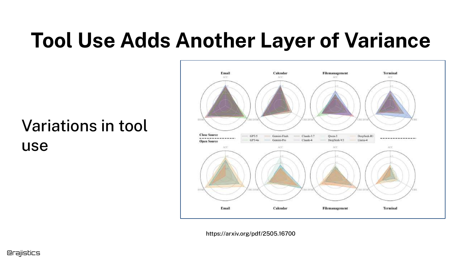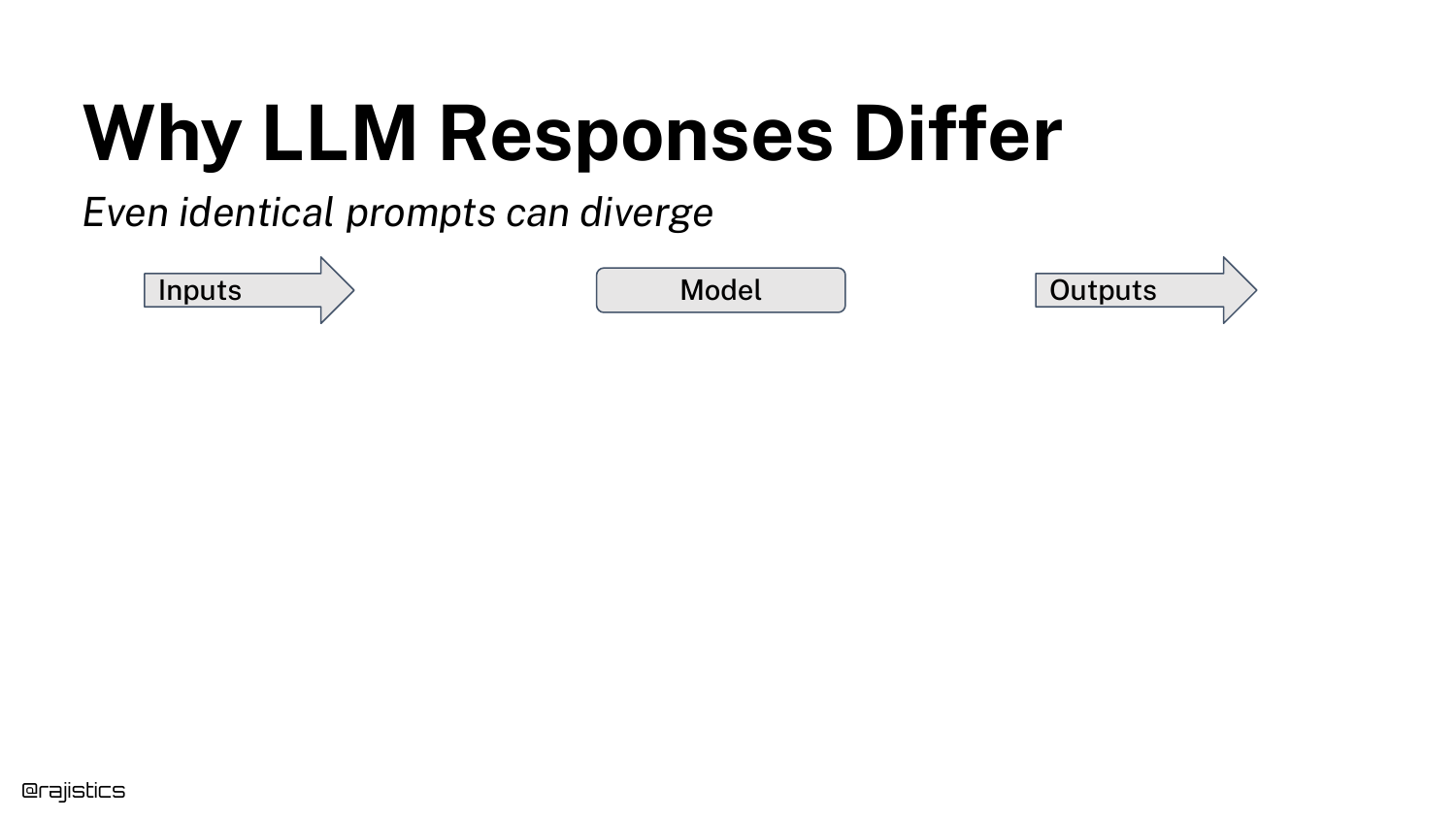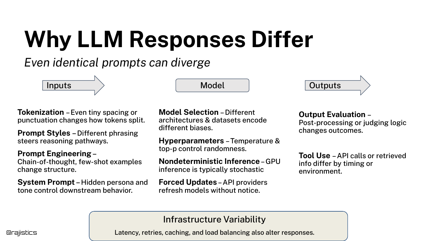 A simple diagram illustrates the flow: Prompt -> Model -> Output. Rajiv uses this to structure the analysis of where variability comes from.