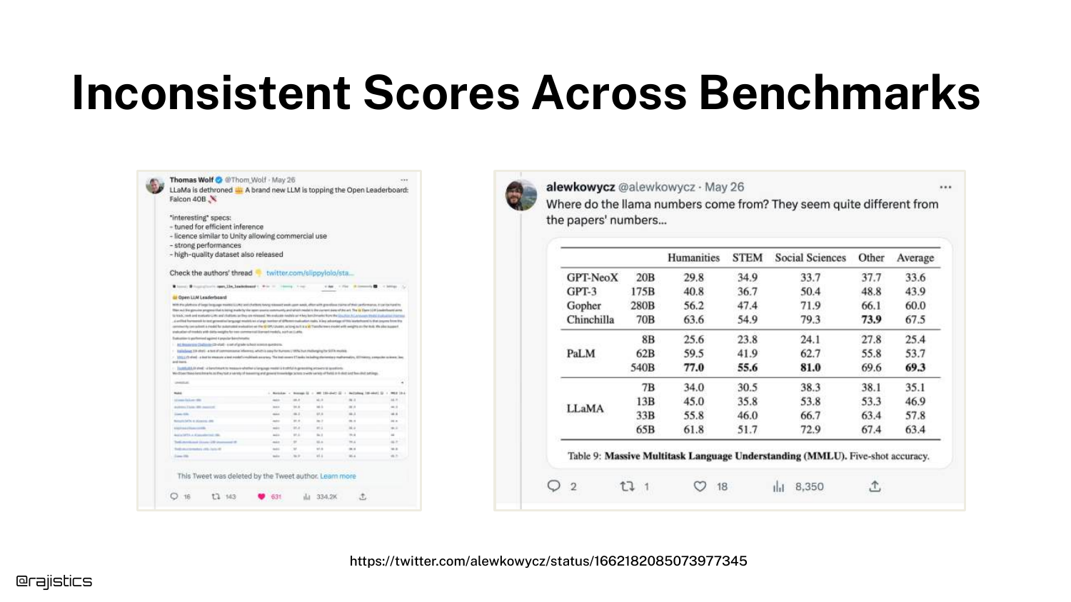 The slide presents a discrepancy between benchmark scores tweeted by Hugging Face and those in the official Llama paper. Both used the same dataset (MMLU), but reported different accuracy numbers.