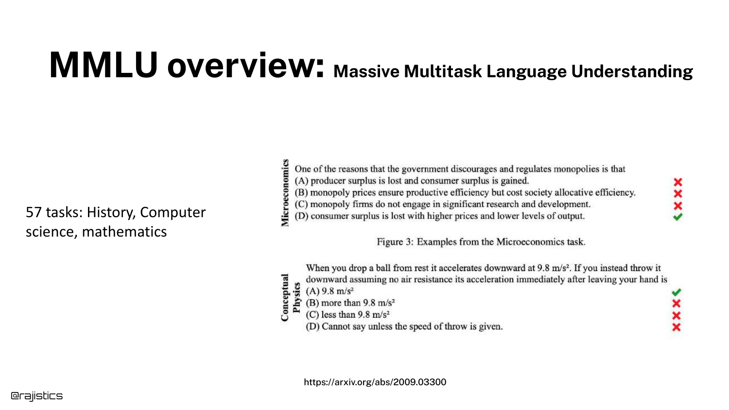 MMLU (Massive Multitask Language Understanding) is explained here. It is a multiple-choice test covering 57 tasks across STEM, the humanities, and more.