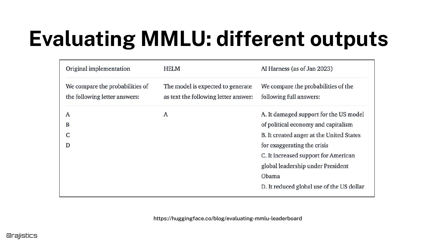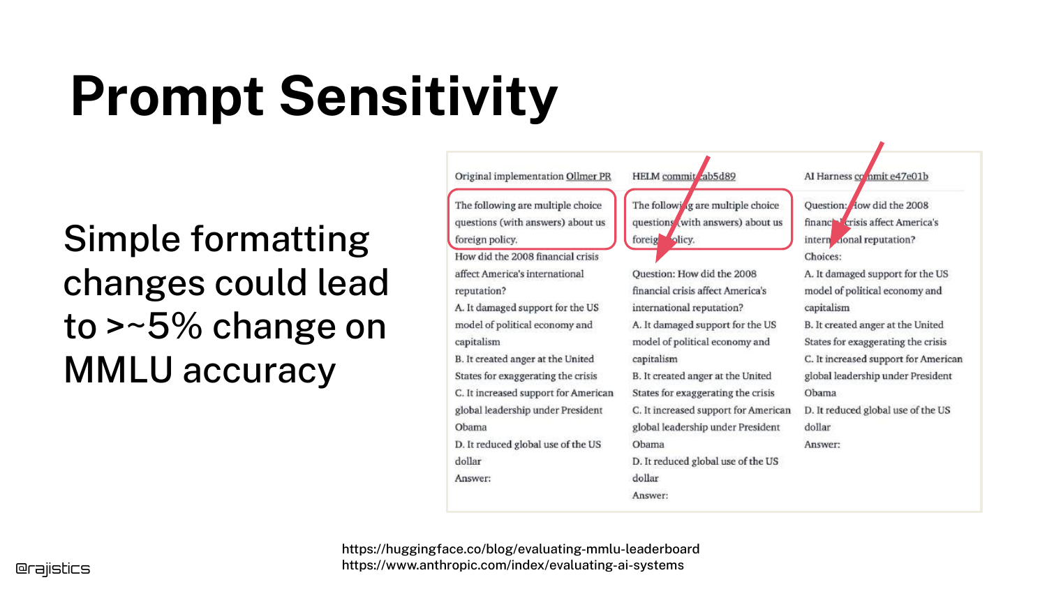 This slide reveals why the scores in Slide 21 differed. The three evaluation harnesses used slightly different prompt structures (e.g., using the word “Question” vs. just listing the text).