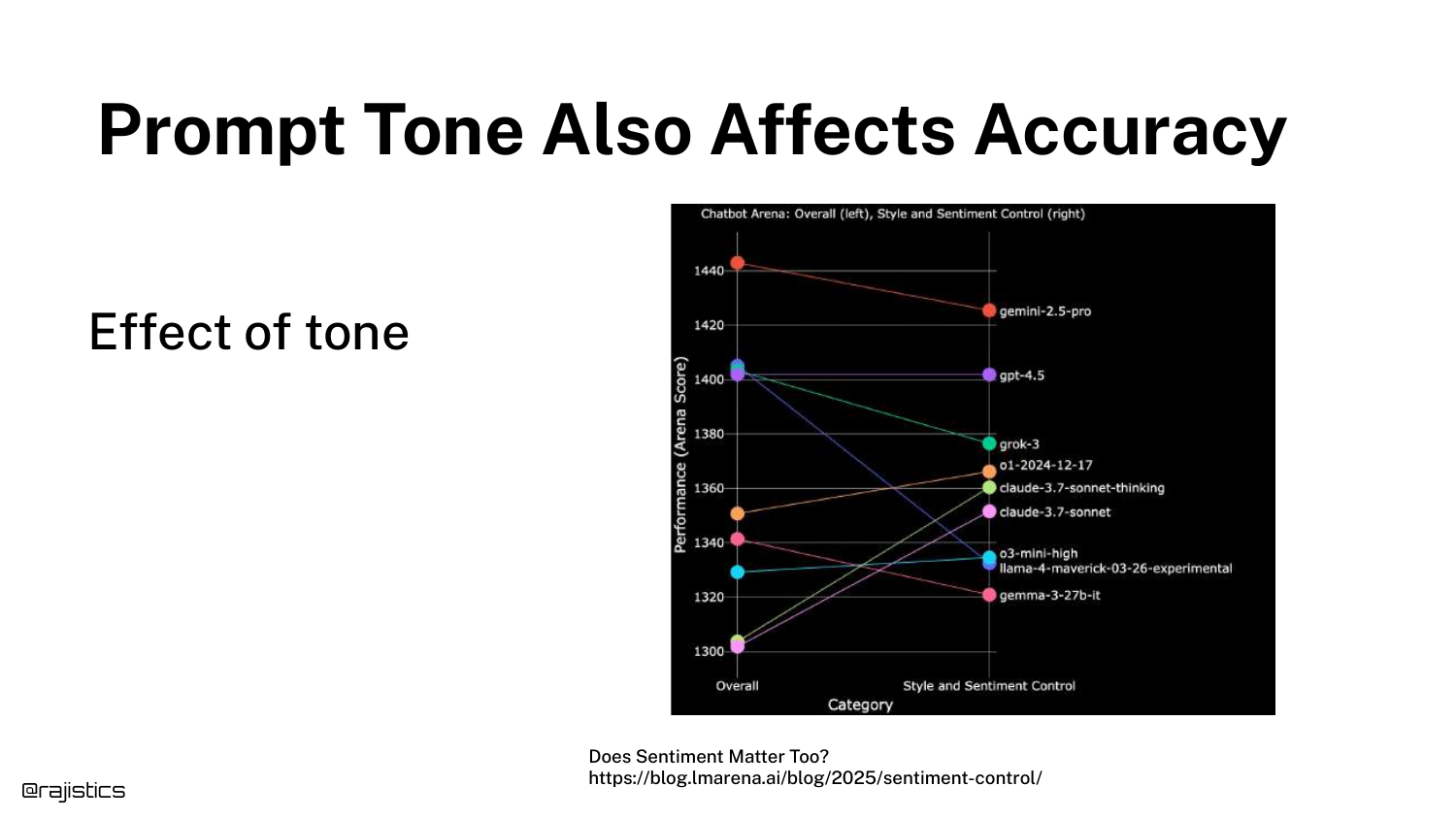 This slide shows that the tone of a prompt (e.g., being polite vs. direct) affects accuracy. Rajiv jokes, “I guess this is why mom always said to be polite.”